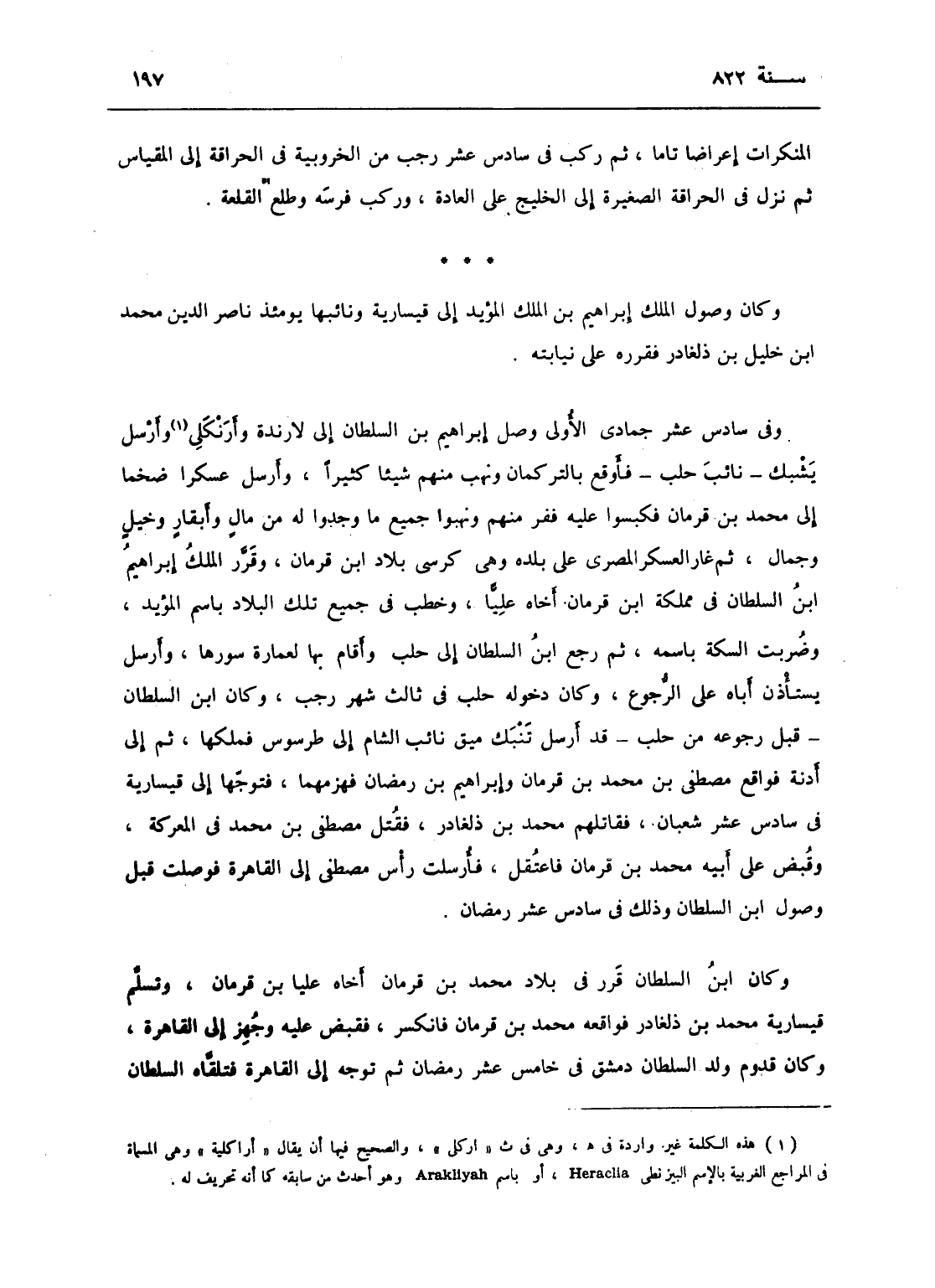 وفي سادس عشر جمادى الأولى وصل إبراهيم بن السلطان إلى لارندة وأركلى بها وأرسل يشبك نائب حلب فأوقع بالتركمان ونهب منهم شيئاً كثيراً وأرسل عسكراً ضخماً إلى محمد بن قرمان فكبسوا عليه ففر منهم ونهب جميع ما وجدوا له من مال وأثقال وخيل وجمال، ثم غلب العسكر المصري على بلده وهي كرسي بلاد ابن قرمان، وقرر الملك إبراهيم بن السلطان المؤيد في مملكة ابن قرمان أخاه علياً وخطب في جميع تلك البلاد باسم المؤيد وضربت السكة باسمه، ثم رجع ابن السلطان إلى حلب وأقام بها لعمارة سورها وأرسل يستأذن أباه على الرجوع وكان دخوله حلب في ثالث شهر رجب، وكان إبراهيم بن السلطان قبل رجوعه من حلب قد أرسل تاني بك ميق نائب الشام إلى طرسوس فملكها، ثم إلى أذنة فواقع مصطفى بن محمد بن قرمان وإبراهيم بن رمضان فهزمها، فتوجها إلى قيسارية في سادس عشر شعبان فقاتلهم محمد بن دلغادر فقتل مصطفى بن محمد بن قرمان في المعركة وقبض على أبيه محمد ابن قرمان فاعتقل، وأرسلت راس مصطفى إلى القاهرة فوصلت قبل وصول ابن السلطان وذك في سادس عشر رمضان، ثم توجه الى القاهرة فتلقاه السلطان
