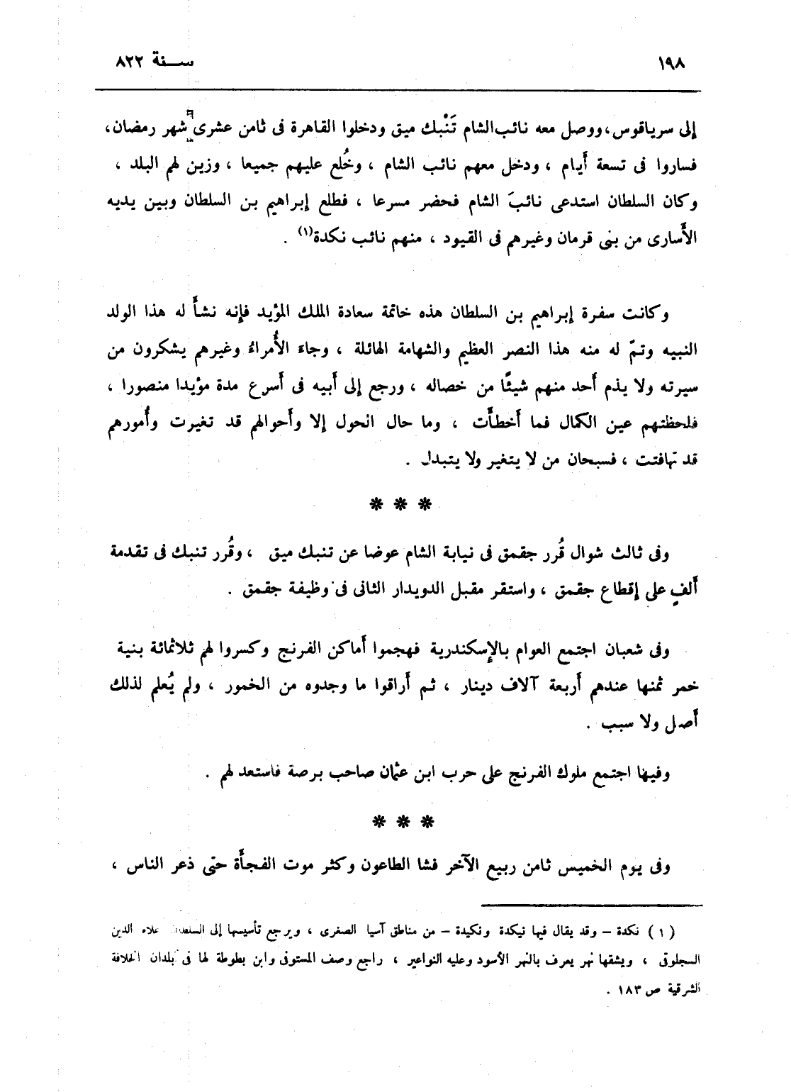 الى سرياقوس ووصل معه نائب الشام تاني بك ميق ودخلوا القاهرة في ثامن عشرى شهر رمضان. وكان ابن السلطان قرر في بلاد محمد بن قرمان أخاه على بن قرمان وتسلم قيسارية محمد ابن دلغادر فواقعه محمد بن قرمان فانكسر وقبض عليه وجهز إلى القاهرة، وكان قدوم إبراهيم ابن السلطان المؤيد دمشق في خامس عشر رمضان فساروا في تسعة أيام ودخل معهم نائب الشام وخلع عليهم جميعاً وزينت لهم البلد، وكان السلطان استدعى نائب الشام فحضر مسرعاً وطلع إبراهيم ابن السلطان وبين يديه الأسارى من بني قرمان وغيرهم في القيود منهم نائب نكدة، وكانت سفرة إبراهيم بن السلطان هذه خاتمة سعادة الملك المؤيد، فإنه نشأ له هذا الولد النبيه وتم له منه هذا النصر العظيم والشهامة الهائلة، وجاء الأمراء وغيرهم يشكرون من سيرته ولا يذم أحد منهم شيئاً من خصاله، ثم رجع إلى أبيه في أسرع مدة مؤيداً منصوراً، فلحظتهم عين الكمال فما أخطأت وما حال الحول إلا وأحوالهم قد تغيرت وأمورهم قد تهافتت - فسبحان من لا يتغير ولا يتبدل! وفي ثالث شوال قرر جقمق في نيابة الشام عوضاً عن تاني بكي ميق وقرر تاني بك ميق في تقدمة ألف على إقطاع جقمق، واستقر مقبل الدويدار الثاني في وظيفة جقمق في الدوادارية الكبرى.