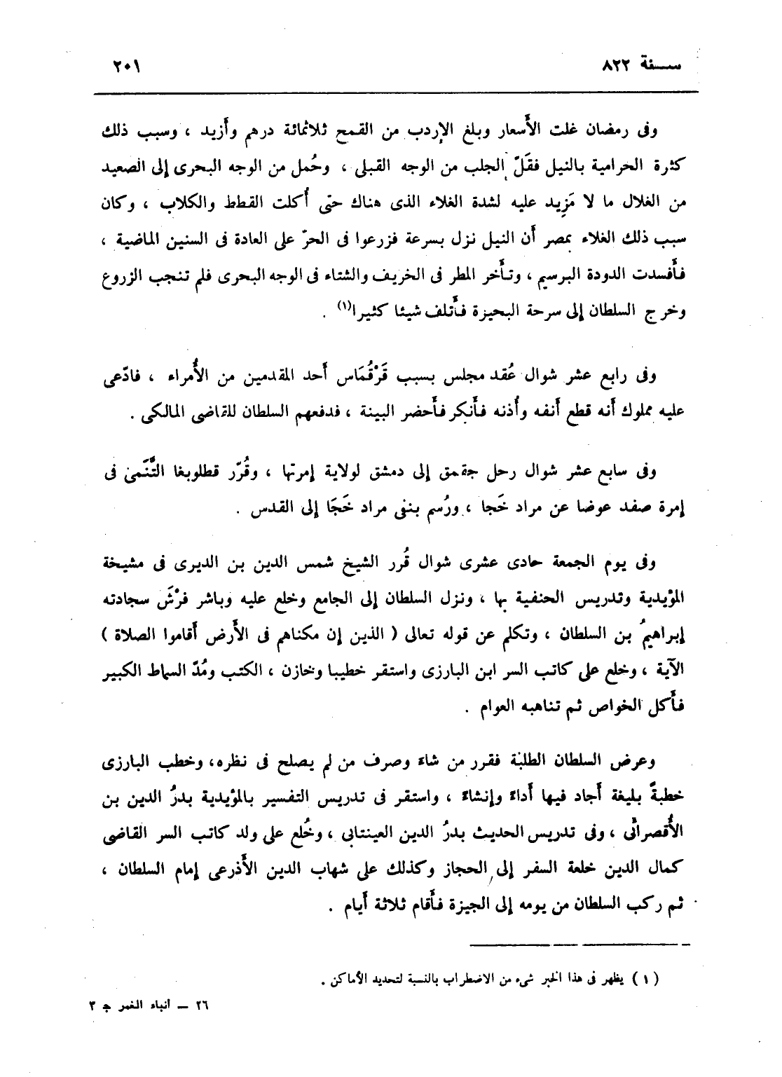 وفي رمضان غلت الأسعار وبلغ الإردب من القمح ثلاثمائة درهم وأزيد، وسبب ذلك كثرة الحرامية بالنيل، فقل الجلب من الوجه القبلي وحمل من الوجه البحري إلى الصعيد من الغلال ما لا مزيد عليه لشدة الغلاء الذي هناك حتى أكلت القطاط والكلاب، وكان سبب ذلك الغلاء بمصر أن النيل نزل بسرعة فزرعوا في الحر على العادة في السنين الماضية فأفسدت الدودة البرسيم، وتأخر المطر في الخريف والشتاء في الوجه البحري فلم تنجب الزروع، وخرج السلطان إلى سرحة البحيرة فأتلف شيئاً كثيراً.