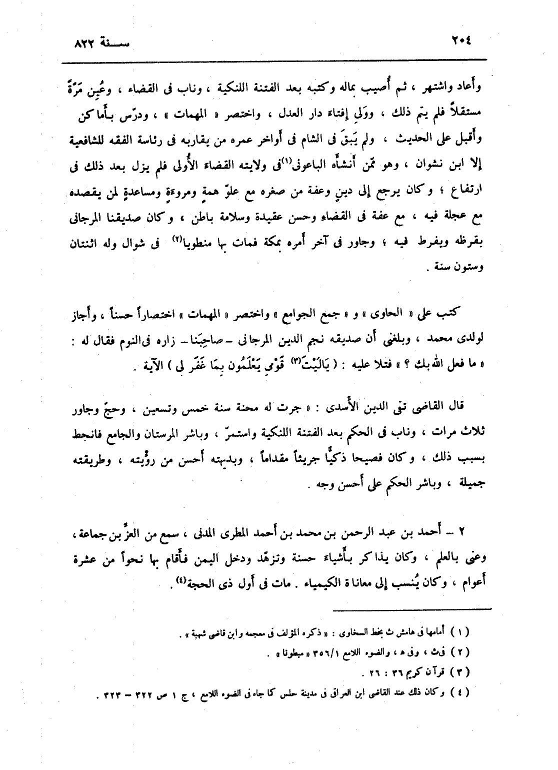 وأعاد واشتهر، ثم أصيب بماله وكتبه بعد الفتنة اللنكية، وناب في القضاء وعين مرة مستقلاً فلم يتم ذلك، وولي إفتاء دار العدل واختصر المهمات ودرس بأماكن وأقبل على الحديث، ولم يبق بالشام في أواخر عمره له من يقاربه في رئاسة الفقه للشافعة إلا ابني نشوان، وهو من أناءه الباعوني في ولايته القضاء الأولى، فلم يزل بعد ذلك في ارتفاع، وكان يرجع إلى دين وعفة من صغره مع علو همة ومروءة ومساعدة لمن يقصده مع عجلة فيه مع عفة في القضاء وحسن عقيدة وسلامة باطن، فكان صديقنا المرجاني يقرظه ويفرط فيه، وجاور في آخر أمره بمكة فمات بها مبطوناً في شوال وله اثنتان وستون سنة، كتب على الحاوي وجمع الجوامع واختصر المهمات اختصاراً حسناً وأجاز لولدي محمد، وبلغني أن صديقه محمد نجم الدين المرجاني صاحبنا رآه في النوم فقال له: ما فعل الله بك؟ فتلا عليه " يليت قوى يعلمون بما غفر لي " الآية، قال القاضي تقي الدين الأسدي: جرت له محنة سنة خمس وتسعين، وحج وجاور ثلاث مرات، وناب في الحكم بعد الفتنة، واستمر وباشر المارستان والجامع فانحط بسبب ذلك، وكان فصيحاً ذكياً جرياً مقداماً، بديهته أحسن من رويته وطريقته جميلة، باشر الحكم على أحسن وجه.