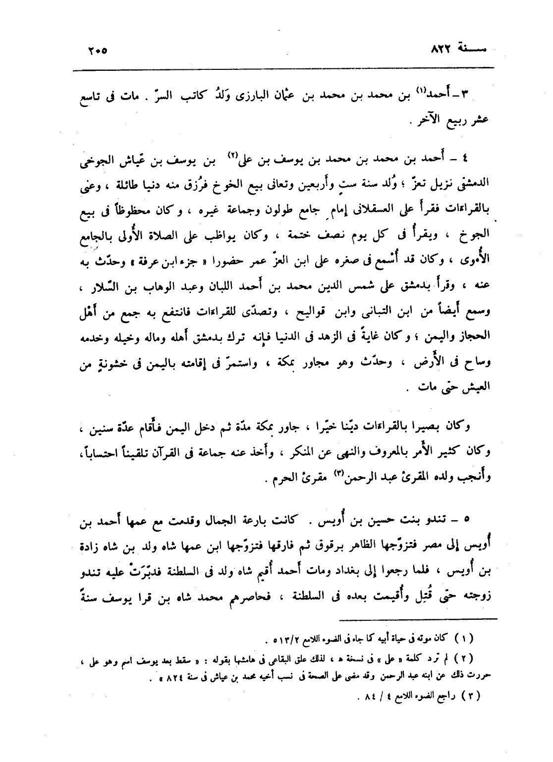 أحمد بن محمد بن محمد بن يوسف بن عياش. الجوخي الدمشقي، نزيل تعز، ولد سنة ست وأربعين، وتعانى بيع الجوخ فرزق منه دنيا طائلة، وعني بالقراآت فقرأ على العسقلاني إمام جامع طولون وجماعة غيره، وكان محظوظاً في بيع الجوخ، ويقرأ كل يوم نصف ختمة، وكان يواظب على الصلاة الأولى بالجامع الأموي، وكان قد أسمع في صغره على علي بن العز عمر حضوراً جزء ابن عرفة وحدث به عنه، وقرأ بدمشق على شمس الدين محمد بن أحمد اللبان وعبد الوهاب بن السلار، وسمع أيضاً من ابن التباني وابن قوالح، وتصدى للقراآت فانتفع به جمع من أهل الحجاز واليمن، وكان غاية في الزهد في الدنيا فإنه ترك بدمشق أهله وماله وخيله، خدمه وساح في الأرض، وحدث وهو مجاور بمكة، واستمر في إقامته باليمن في خشونة من العيش حتى مات، وكان بصيراً بالقراآت، دينا خيراً، جاور بمكة مدة، ثم دخل اليمن فأقام عدة سنين، وكان كثير الأمر بالمعروف والنهي عن المنكر، وأخذ عنه جماعة في القرآن تلقينا احتساباً، وأنجب ولده المقرئ عبد الرحمن مقرئ الحرم.