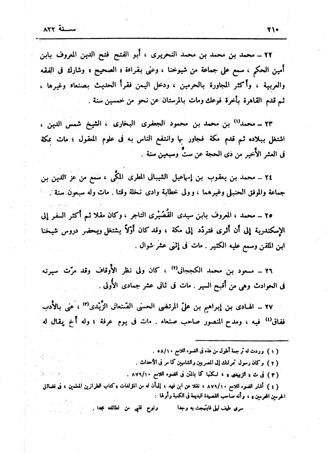 محمد بن محمد بن محمد، النحريري أبو الفتح فتح الدين المعروف بابن أمين الحكم، سمع على جماعة من شيوخنا، وعني بقراءة الصحيح، وشارك في الفقه والعربية، وأكثر المجاورة بالحرمين، ودخل اليمن فقرأ الحديث بصنعاء وغيرها، ثم قدم القاهرة بأخرة فوعك ومات بالمارستان عن نحو من خمسين سنة.