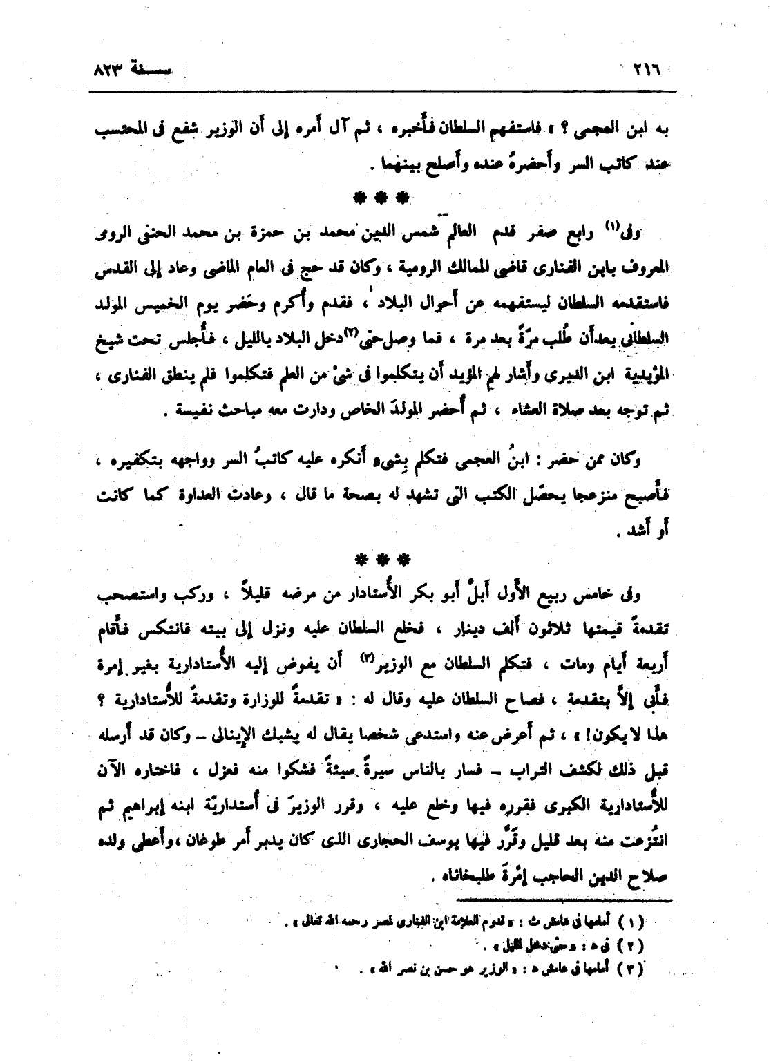 به ابن العجمي؟ فاستفهم السلطان فاخبره، ثم آل أمره إلى أن الوزير شفع في المحتسب عند كاتب السر وأحضره عنده وأصلح بينهما.