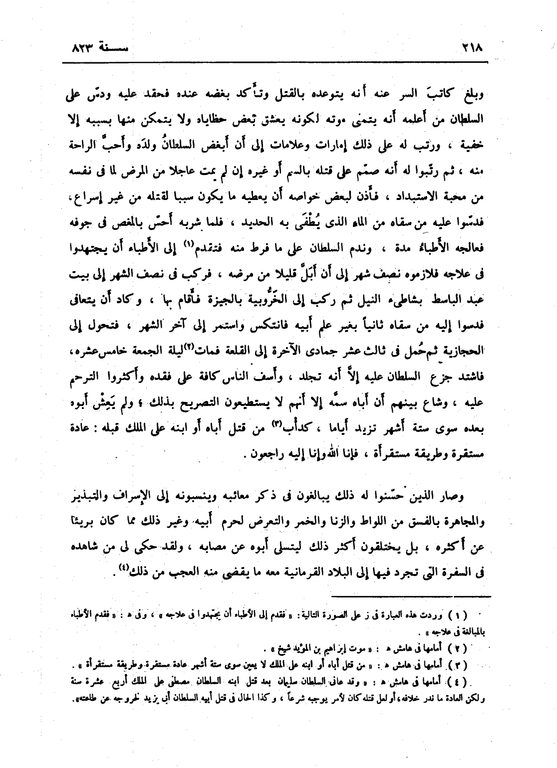 وبلغ كاتب السر عنه أنه يتوعده بالقتل وتأكد بغضه عنده فحقد عليه ودس على السلطان من أعلمه أنه يتمنى موته لكونه يعشق بعض حظاياه ولا يتمكن منها بسببه إلا خفية، ورتب له على ذلك إمارات وعلامات إلى أن أبغض السلطان ولده وأحب الراحة عنه، ورتبوا له أنه صمم على قتله بالسم أو بغيره إن لم يمت عاجلاً من المرض لما في نفسه من محبة الاستبداد، فأذن لبعض خواصه أن يعطيه ما يكون سبباً لقتله من غير إسراع، فدسوا عليه من سقاه من الماء الذي يطفأ فيه الحديد، فلما شربه أحس بالمغص في جوفه فعالجه الأطباء مدة وندم السلطان على ما فرط فيه، فتقدم الأطباء بالمبالغة في علاجه فلازموه نصف شهر إلى أن أبل قليلاً من مرضه فركب في نصف الشهر إلى بيت عبد الباسط بشاطئ النيل. ثم ركب إلى الخروبية بالجيزة فأقام بها وكاد أن يتعافى، فدسوا من سقاه ثانياً بغير علم أبيه، فانتكس واستمر إلى آخر الشهر فتحول إلى الحجازية، ثم حمل في ثالث عشر جمادى الآخرة إلى القلعة فمات ليلة الجمعة خامس عشره، فاشتد جزع السلطان عليه إلا أنه تجلد، وأسف الناس كافة على فقده وأكثروا الترحم عليه، وشاع بينهم أن أباه سمه إلا أنهم لا يستطيعون التصريح بذلك، ولم يعش أبوه بعده سوى ستة أشهر تزيد أياماً، كدأب من قتل أباه أو ابنه على الملك قبله عادة مستقرة وطريقة مستقرأة - فإنا لله وإنا راجعون، وصار الذين حسنوا له ذلك يبالغون في ذكر معايبه وينسبونه إلى الإسراف والتبذير والمجاهرة بالفسق من اللواط والزنا والخمر والتعرض لحرم أبيه وغير ذلك مما كان برياً من أكثره بل يختلقون أكثر ذلك ليتسلى أبوه عن مصابه به.