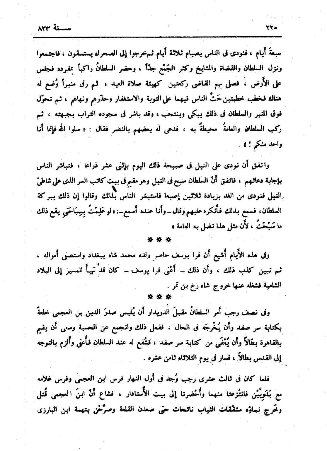 سبعة أيام، فنودي في الناس بصيام ثلاثة أيام ثم خرجوا إلى الصحراء يستسقون. فاجتمعوا ونزل السلطان والقضاة والمشايخ وكثر الجمع جداً، وحضر السلطان راكباً بمفرده فجلس على الأرض، فصلى بهم القاضي ركعتين كهيئة صلاة العيد، ثم رقي منبراً وضع له هناك فخطب خطبتين حث الناس فيهما على التوبة والاستغفار وحذرهم ونهاهم وتحول فوق المنبر، والسلطان في ذلك يبكي وينتحب وقد باشر في سجوده التراب بجبهته، ثم ركب السلطان والعامة محيطة به، فدعا له بعضهم بالنصر فقال: سلوا الله فإنما أنا واحد منكم، واتفق أن نودي على النيل في صبيحة ذلك اليوم باثني عشر ذراعاً، فتباشر الناس بإجابة دعائهم، فاتفق أن السلطان سبح في النيل وهو مقيم في بيت كاتب السر الذي على شاطئ النيل فنودي من الغد بزيادة ثلاثين إصبعاً، فاستبشر الناس بذلك وقالوا إن ذلك ببركة السلطان، فسمع السلطان بذلك فأنكره عليهم وقال: وأنا عنده أسمع: لو علمت بسباحتي يقع ذلك لما سبحت، لأن مثل هذا يضل به العامة، وفي هذه الأيام أشيع أن قرا يوسف حاصر ولده محمد شاه ببغداد واستصفى أمواله، ثم تبين كذب ذلك وأن قرا يوسف كان قد تهيأ للمسير إلى البلاد الشامية. فشغله عنها خروج شاه رخ بن تمر.