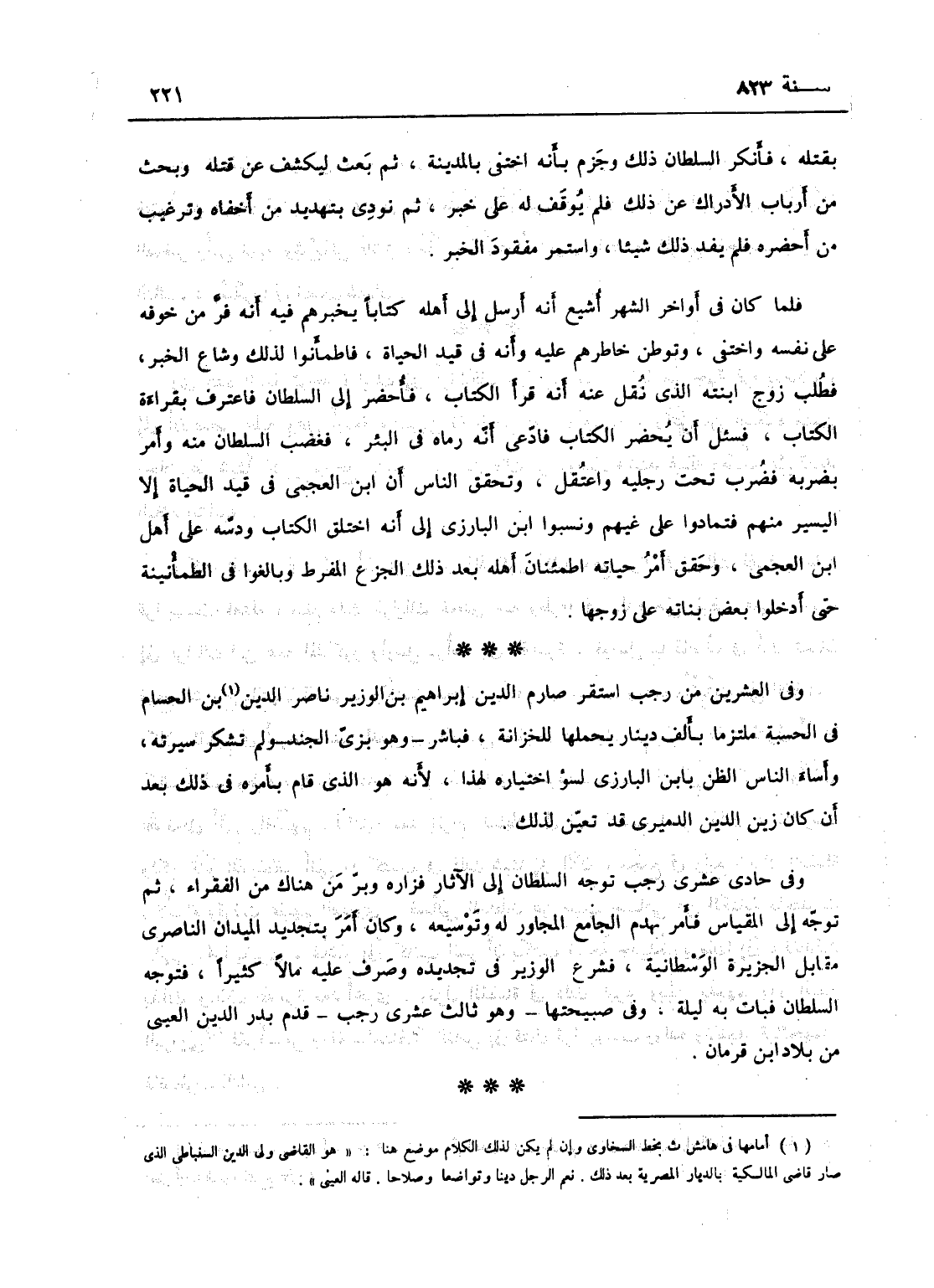 بقتله فأنكر السلطان ذلك وجزم بأنه اختفى بالمدينة، ثم بعث ليكشف عن قتله وبحث من أرباب الإدراك عن ذلك فلم يوقف له على خبر، ثم نودي بتهديد من أخفاه وترغيب من أحضره فلم يفد ذلك شيئاً واستمر مفقود الخبر، فلما كان في أواخر الشره أشيع أنه أرسل إلى أهله كتاباً يخبرهم فيه أنه فر من خوفه على نفسه واختفى، وتوطن خواطرهم عليه وأنه في قيد الحياة فاطمأنوا لذلك وشاع الخبر، فطلب زوج ابنته الذي نقل عنه أنه قرأ الكتاب فأحضر إلى السلطان فاعترف بقراءة الكتاب، فسئل أن يحضر الكتاب فادعى أنه رماه في البئر، فغضب السلطان منه وأمر بضربه فضرب تحت رجليه واعتقل، وتحقق الناس أن ابن العجمي في قيد الحياة إلا اليسير منهم فتمادوا على غيهم ونسبوا ابن البارزي إلى أنه اختلق الكتاب ودسه على أهل ابن العجمي، وحقق أمر حياته اطمئنان أهله بعد ذلك الجزع المفرط، وبالغوا في الطمأنينة حتى أدخلوا بعض بناته على زوجها.