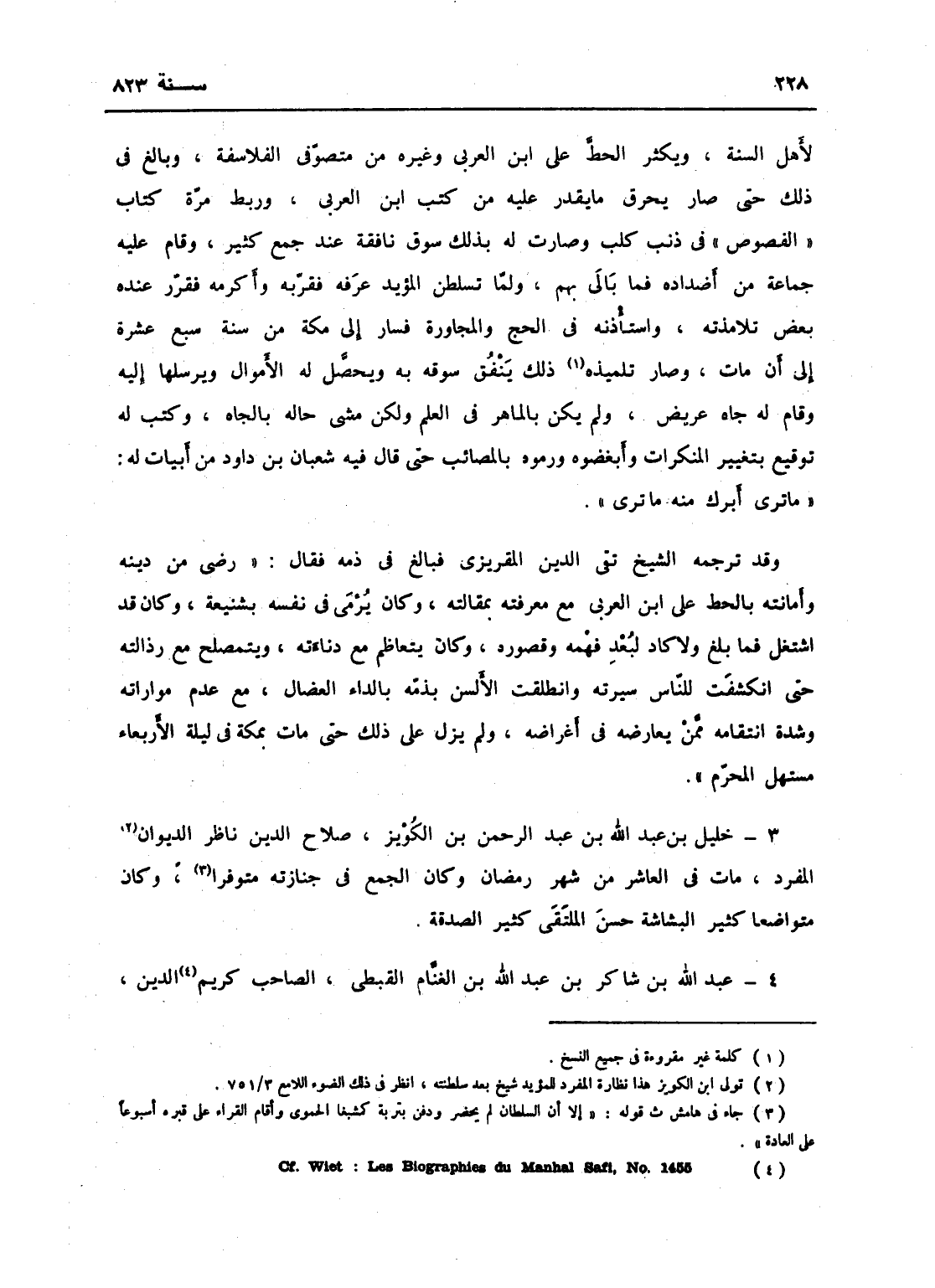لأهل السنة ويكثر الحط على ابن العربي وغيره من متصوفي الفلاسفة، وبالغ في ذلك حتى صار يحرق ما يقدر عليه من كتب ابن العربي وربط مرة كتاب الفصوص في ذنب كلب، وصارت له بذلك سوق نافقة عند جمع كثير، وقام عليه جماعة من أضداده فما بالى بهم، ولما تسلطن المؤيد عرفه فقربه وأكرمه فقرر عنده بعض تلامذته واستأذنه في الحج والمجاورة، فصار إلىمكة فأقام بها من سنة سبع عشرة إلى أن مات، وصار تلميذه ذلك ينفق سوقه به ويحصل له الأموال ويرسلها وقام له جاه عريض ويم يكن بالماهر في العلم ولكن مشى حاله بالجاه وكتب له توقيع بتغيير المنكرات فأبغضوه ورموه بالمصائب حتى قال فيه شعبان بن داود الآثاري من أبيات: