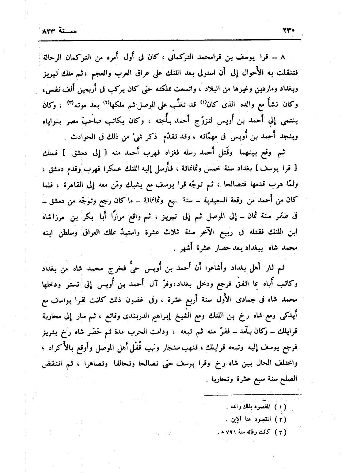 قرا يوسف بن قرا محمد التركماني، كان في أول أمره من التركمان الرحالة فتنقلت به الأحوال إلى أن استولى بعد اللنك على عراق العرب والعجم، ثم ملك تبريز وبغداد وماردين وغيرها، واتسعت مملكته حتى كان يركب في أربعين ألف نفس، وكان نشأ مع والده، وكان قد تغلب على الموصل ثم ملكها بعده، وكان ينتمي إلى أحمد بن أويس، وتزوج أحمد أخته وكان يكاتب صاحب مصر وابنه بعد أحمد بن أويس في مهماته - وقد تقدم ذكر شيء من ذلك في الحوادث، ثم وقع بينهما وقتل أحمد رسله فغزاه فهرب أحمد منه، فملك بغداد سنة خمس وثمانمائة، فأرسل اللنك عسكراً فهرب وقدم دمشق، وكان أحمد لما هرب قدمها فتصالحا، ثم توجه قرا يوسف مع يشبك ومن معه إلى القاهرة، فلما كان من وقعة السعيدية سنة سبع وثمانمائة ما كان رجع، وتوجه من دمشق في صفر سنة ثمان إلى الموصل ثم إلى تبريز، ثم واقع مراراً أبي بكر بن مرزا شاه بن اللنك فقتله في ربيع الآخر سنة ثلاث عشرة واستبد بملك العراق، وسلطن ابنه محمد شاه ببغداد بعد حصار عشرة أشهر، ثم ثار أهل بغداد وأشاعوا أن أحمد بن أويس حي، فخرج محمد شاه من بغداد وكاتب أباه بما اتفق فرجع ودخل بغداد، وفر آل أحمد بن أويس إلى تستر، ودخلها محمد شاه في جمادى الأولى سنة أربع عشرة، وفي غضون ذلك كانت لقرا يوسف مع ليدكي ومع شاه رخ ابن اللنك ومع الشيخ إبراهيم الدربندي وقائع، ثم سار إلى محاربة قرا يلك وكان بآمد ففر منه وتبعه، ودامت الحرب مدة ثم حصر شاه رخ بتبريز فرجع قرا يوسف، وتبعه قرا يلك فنهب سنجار ونهب قبل أهل الموصل وأوقع بالأكراد، واختلف الحجال بين شاه رخ وقرا يوسف حتى تحالفا وتصالحا وتصاهرا، ثم انتقض الصلح سنة سبع عشر وتحاربا.