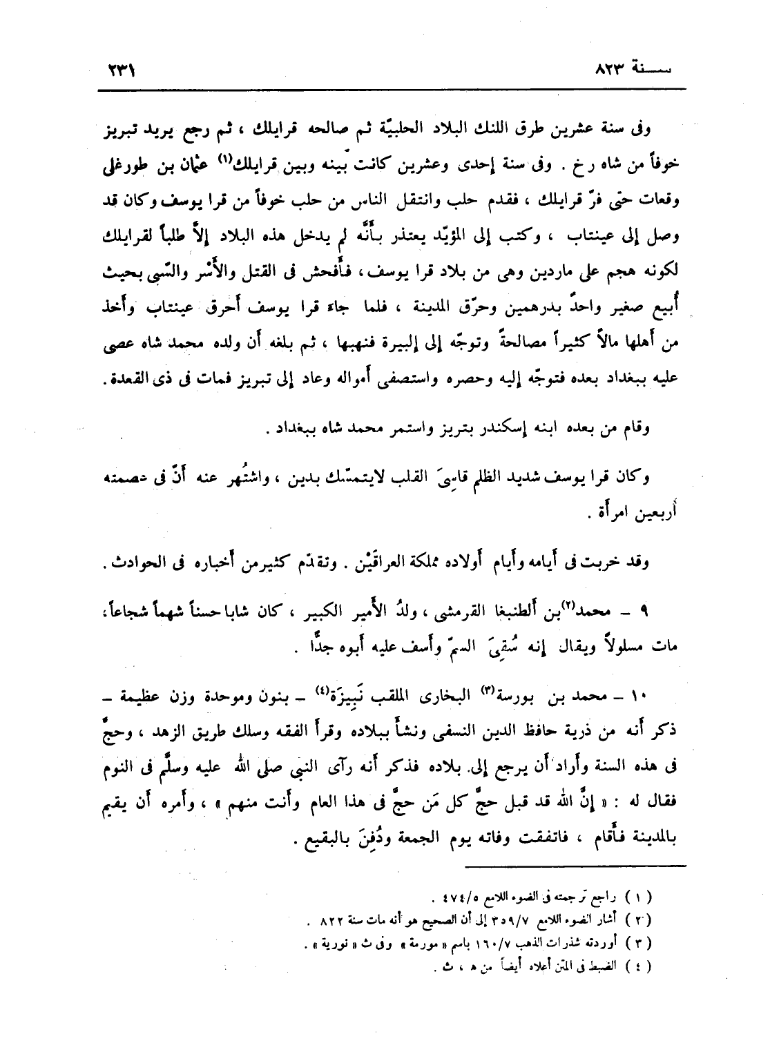 وفي سنة إحدى وعشرين كانت بينه وبين قرا يلك عثمان بن طورغلي وقعات حتى فر قرا يلك فقدم حلب، انتقل الناس من حلب خوفاً من قرا يوسف وكان قد وصل إلى عينتاب، وكتب إلى المؤيد يعتذر بأنه لم يدخل هذه البلاد إلا طلباً لقرا يلك لكونه هجم على ماردين وهو من بلاد قرا يوسف فأفحش في القتل والأسر والسبي بحيث بيع صغير واحد بدرهمين وحرق المدينة، فلما جاء قرا يوسف أحرق عينتاب وأخذ من أهلها مالاً كثيراً مصالحة وتوجه إلى البيرة فنهبها، ثم بلغه أن ولده محمد شاه عصى عليه ببغداد فتوجه وحصره واستصفى امواله وعاد إلى تبريز، فمات في ذي القعدة وقام من بعده ابنه إسكندر بتبريز، واستمر محمد شاه ببغداد، وكان قرا يوسف شديد الظلم قاسي القلب لا يتمسك بدين، واشتهر عنه أن في عصمته أربعين امرأة، وقد خربت في أيامه وأيام أولاده مملكة العراقين - وتقدم كثير من أخباره في الحوادث.