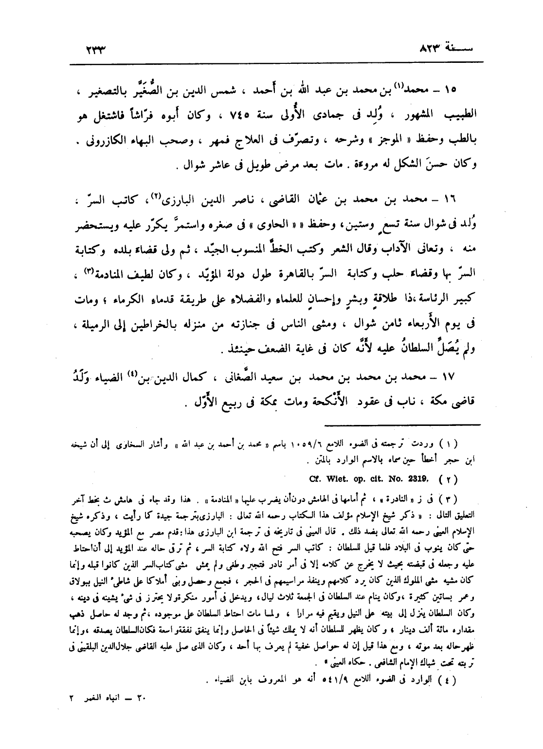 محمد بن محمد بن عثمان، القاضي ناصر الدين البارزي كاتب السر، ولد في شوال سنة تسع وستين، وحفظ الحاوي في صغره واستمر يكرر عليه ويستحضر منه، وتعانى الآداب وقال الشعر، وكتب الخط الجيد، ثم ولي قضاء بلده وكتابة السر بها وقضاء حلب وكتابة السر بالقاهرة طول دولة المؤيد. وكان لطيف المنادمة كثير الرئاسة ذا طلاقة وبشر وإحسان للعلماء والفضلاء على طريقة قدماء الكرماء، ومات في يوم الأربعاء ثامن شوال، ومشى الناس في جنازته من منزله بالخراطين إلى الرميلة، ولم يصل السلطان عليه لأنه كان في غاية الضعف حينئذ.