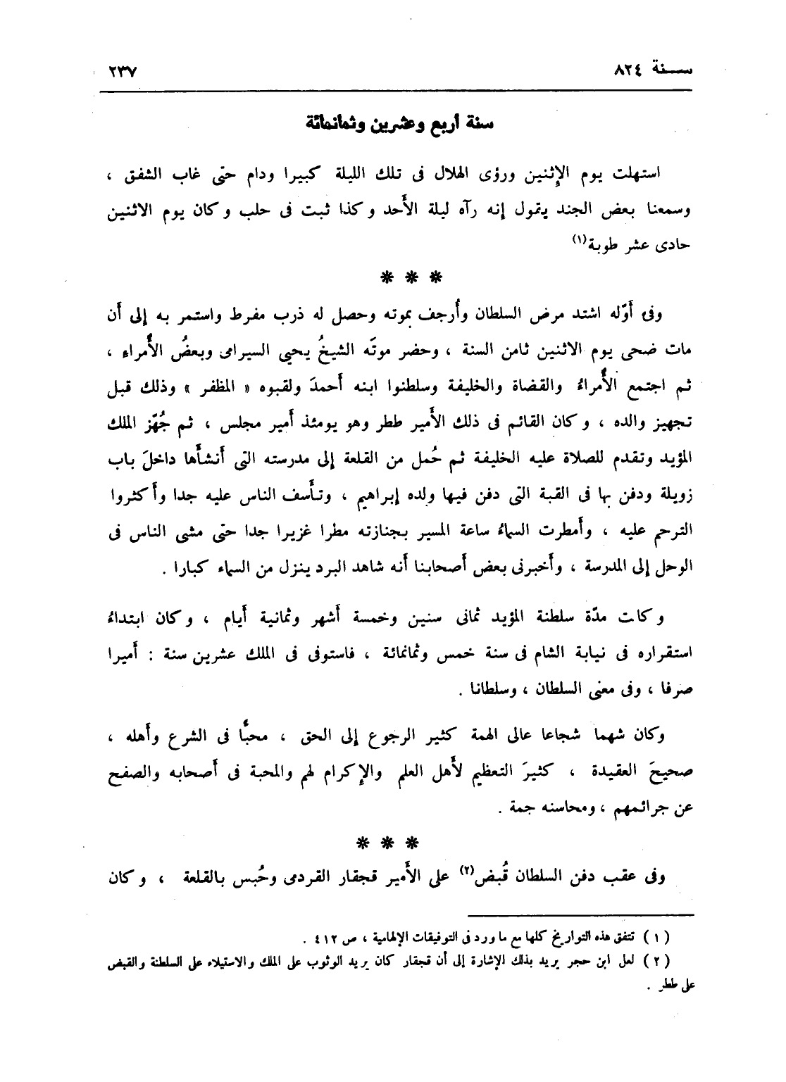 استهلت يوم الاثنين ورئي الهلال في تلك الليلة كبيراً ودام حتى غاب الشفق، وسمعنا بعض الجند يقول إنه رآه ليلة الأحد، كذا ثبت في حلب وكان يوم الاثنين حادي عشر طوبة، وفي أوله اشتد مرض السلطان وأرجف بموته وحصل له ذرب مفرط واستمر إلى أن مات ضحى يوم الاثنين ثامن السنة، وحضر موته الشيخ يحيى السيرامي وبعض الأمراء، ثم اجتمع الأمراء والقضاة والخليفة وسلطنوا ابنه أحمد ولقب المظفر وذلك قبل تجهيز والده، وكان القائم بذلك الأمير ططر وهو يومئذ أمير مجلس، ثم جهز الملك المؤيد وتقدم للصلاة عليه الخليفة، ثم حمل من القلعة إلى مدرسته التي أنشأها داخل باب زويلة، ودفن بها في القبة التي دفن فيها ولده إبراهيم، وتأسف الناس عليه جداً وأكثروا الترحم عليه، وأمطرت السماء ساعة المسير بجنازته مطراً غزيراً جداً حتى مشى الناس في الوحل إلى المدرسة، واخبرني بعض أصحابنا أنه شاهد البرد ينزل من السماء كباراً، وكانت مدة سلطنة المؤيد ثماني سنين وخمسة أشهر وثمانية أيام، وكان ابتدأ استقراره في نيابة الشام في سنة خمس وثمانمائة، فاستوفى في الملك عشرين سنة أميراً صرفاً وفي معنى السلطان وسلطاناً، وكان شهماً شجاعاً عالي الهمة كثير الرجوع إلى الحق محباً في الشرع وأهله صحيح العقيدة كثير التعظيم لأهل العلم والإكرام لهم والمحبة في أصحابه والصفح عن جرائمهم، ومحاسنه جمة.