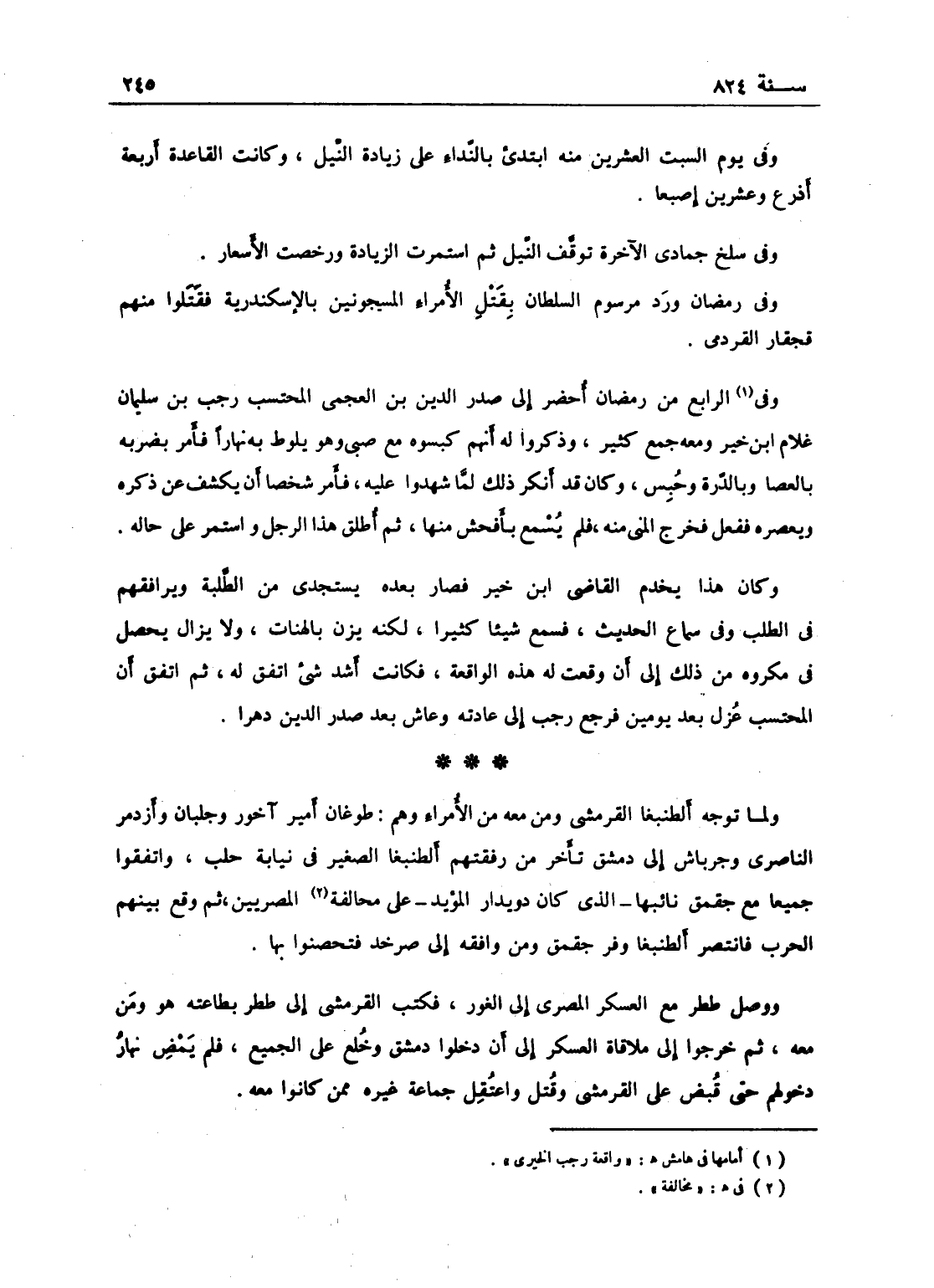 وفي الرابع من رمضان أحضر إلى صدر الدين ابن العجمي المحتسب رجب بن سليمان غلام ابن خير ومعه جمع كثير، فذكروا أنهم كبسوه مع صبي وهو يلوط به نهاراً، فأمر بضربه بالعصي وبالدرة وحبس وكان قد أنكر ذلك لما شهدوا عليه، فأمر شخصاً أن يكشف عن ذكره ويعصره ففعل فخرج منه المني فلم يسمع فأفحش منها، ثم أطلق هذا الرجل واستمر على حاله، وكان هذا يخدم القاضي ابن خير فصار بعده يستجدي من الطلبة ويرافقهم في الطلب وفي سماع الحديث فسمع كثيراً لكنه يزن بالهنات ولا يزال يحصل في مكروه من ذلك إلى أن وقعت له هذا الواقعة فكانت أشد شيء اتفق له، ثم اتفق أن المحتسب عزل بعد يومين فرجع رجب إلى عادته وعاش بعد صدر الدين دهراً، ولما توجه الطنبغا القرمشي ومن معه من الأمراء وهم طوغان أمير آخور وجلبان وآزدمر الناصري وجرباش إلى دمشق وتأخر من رفقتهم الطنبغا الصغير في نيابة حلب واتفقوا مع جقمق نائبها الذي كان دويدار المؤيد على مخالفة المصريين، ثم وقع بينهم الحرب فانتصر الطنبغا وفر جقمق ومن وافقه إلى صرخد فتحصنوا بها ووصل ططر مع العسكر المصري إلى الغور، فكتب القرمشي إلى ططر بطاعته هو ومن معه ثم خرجوا إلى ملاقاة العسكر إلى أن دخلوا دمشق وخلع على الجميع، فلم يمض نهار دخولهم حتى قبض على القرمشي وقتل واعتقل جماعة غيره ممن كان معه،