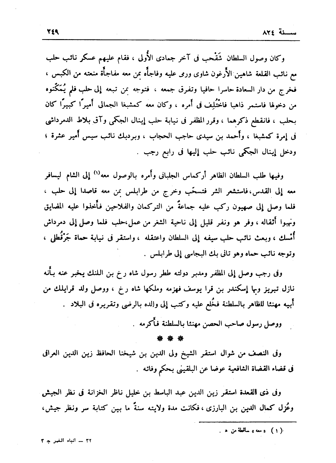 وكان وصول السلطان شقحب في آخر جمادى الأولى، فقام عسكراً حلب مع نائب القلعة شاهين الأرغون شاوي، ورمى عليه وفاجأه بمن تبعه مفاجأة منعته من الكبس، فخرج من دار السعادة حاسراً حافياً وتفرق جمعه، فتوجه بمن معه إلى حلب فلم يمكنوه من دخولها فاستمر ذاهباً، فاختلف في أمره، وكان معه كمشبغا الجمالي أميراً كبيراً كان بحلب فانقطع ذكرهما، وقرر المظفر في نيابة حلب، إينال الجكمي، وآق بلاط الدمرداشي في إمرة كمشبغا، وأحمد ابن سبري حاجب الحجاب، وبردبك نائب سيس أمير عشرة، ودخل إينال الجكمي نائب حلب في رابع رجب ... وطلب السلطان الظاهر أركماس الجلباني فأمره بالوصول إلى الشام ليسافر معه إلى القاهرة، فاستشعر الشر فتسحب وخرج من طرابلس بمن معه قاصداً حلب، فلما وصل إلى صهيون ركب عليه جماعة من التركمان والفلاحين فأخذوا عليه المضايق ونهبوا أثقاله، وفر هو نفر قليل إلى ناحية الشغر من عمل حلب.
