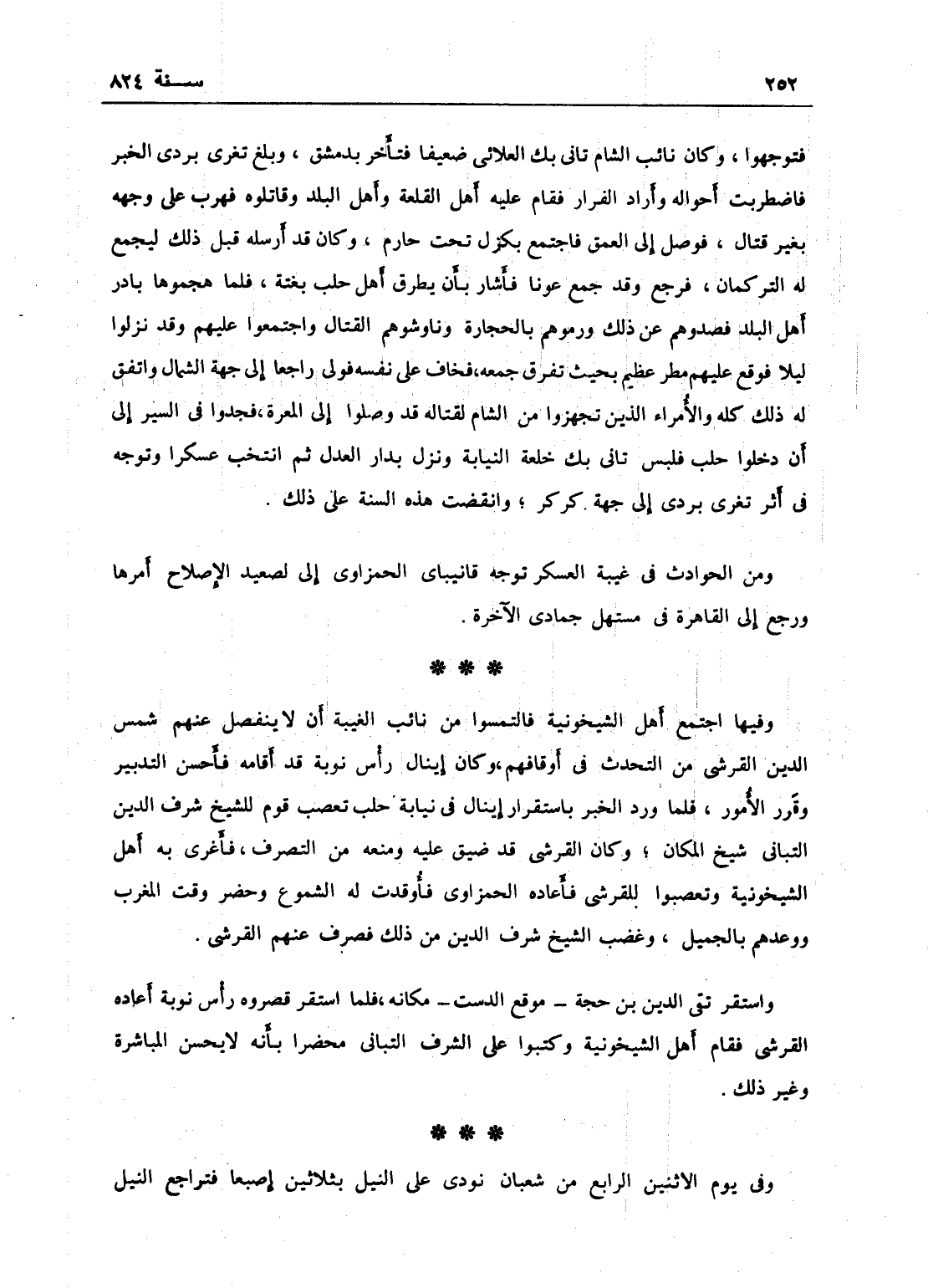 وفيها اجتمع أهل الشيخونية فالتمسوا من نائب الغيبة أن لا ينفصل عنهم شمس الدين القرمشي من التحدث في أوقافهم، وكان إينال راس نوبة قد أقامه فأحسن التدبير وقرر الأمور، فلما ورد الخبر باستقرار إينال في نيابة حلب تعصب قوم للشيخ شرف الدين التباني شيخ المكان، وكان القرمشي قد ضيق عليه ومنعه من التصرف، فأغرى به أهل الشيخونية وتعصبوا للقرمشي فأعاده الحمزاوي، فأوقدت له الشموع وحضر وقت المغرب ووعدهم بالجميل، وغضب الشيخ شرف الدين من ذلك فصرف عنهم القرمشي، واستقر تقي الدين بن حجة موقع الدست في مكانه، فلما استقر قصروه راس نوبة أعاد القرمشي، فقام أهل الشيخونية وكتبوا على الشرف التباني محضراً بأنه لا يحسن المباشرة وغير ذلك.