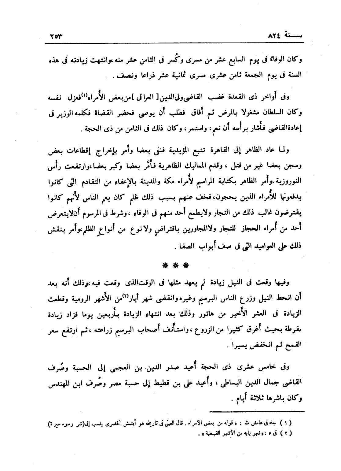 وفي خامس عشري ذي الحجة أعيد صدر الدين ابن العجمي إلى الحسبة وصرف القاضي جمال الدين البساطي، وأعيد علي بن قطيط إلى حسبة مصر وصرف ابن المهندس وكان باشرها ثلاثة أيام،