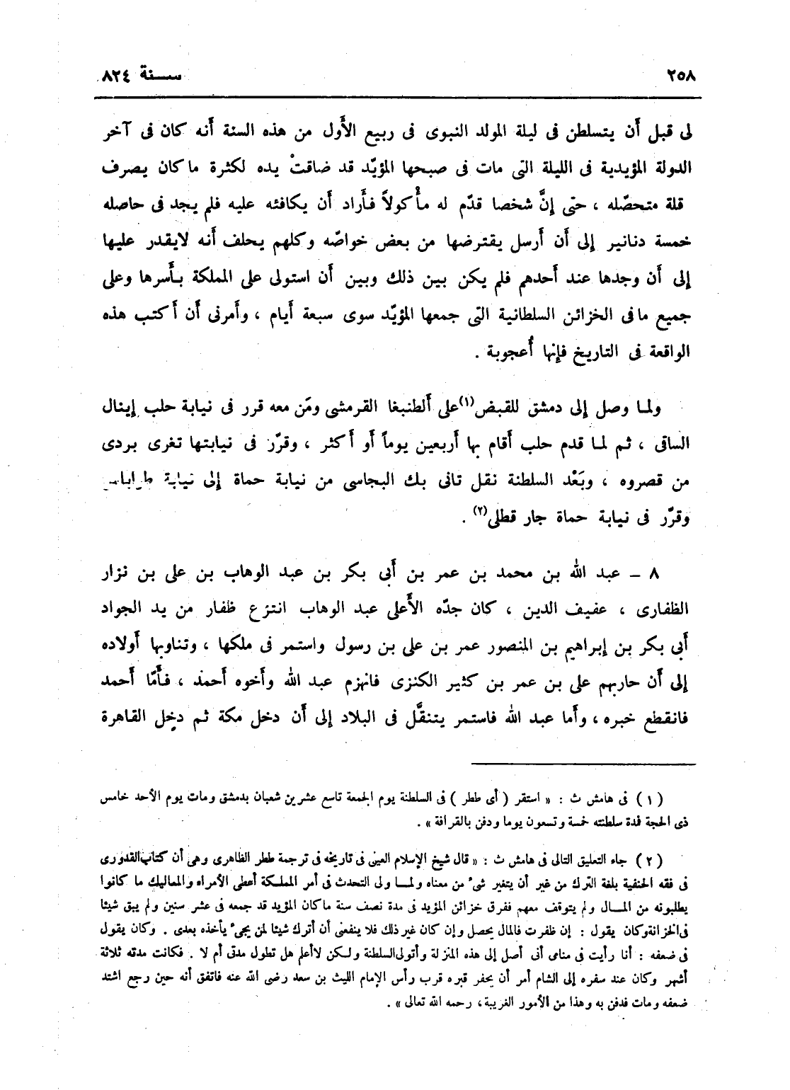 لي قبل أن يتسلطن قي ليلة المولد النبوي في ربيع الأول من هذه السنة أنه كان في آخر الدولة المؤيدية في الليلة التي مات في صبيحتها المؤيد قد ضاقت يده لكثرة ما كان يصرف وقلة متحصلة حتى أن شخصاً قدم له مأكولاً فأراد أن يكافيه عليه فلم يجد قي حاصله خمسة دنانير إلى أن أرسل يقترضها من بعض خواصه فكلهم يحلف أنه لا يقدر عليها إلى أن وجدها عند أحدهم قلم يكن بين ذلك وبين أن استولى على المملكة بأسرها وعلى جميع ما في الخزائن السلطانية التي جمعها المؤيد سوى سبعة أيام؛ وأمرني أن أكتب هذه الواقعة قال في التاريخ فإنها أعجوبة، ولما وصل إلى دمشق وقتل الطنبغا القرمشي ومن معه قرر في نيابة حلب إينال الساقي، ثم لما قدم حلب أقام بها أربعين يوماً أو أكثر وقرر في نيابتها تغرى بردى بن قصروه، وبعد السلطنة نقل تانى بك البجاسي من نيابة حماة إلى نيابة طرابلس وقرر في نيابة حماة جارقطلي.