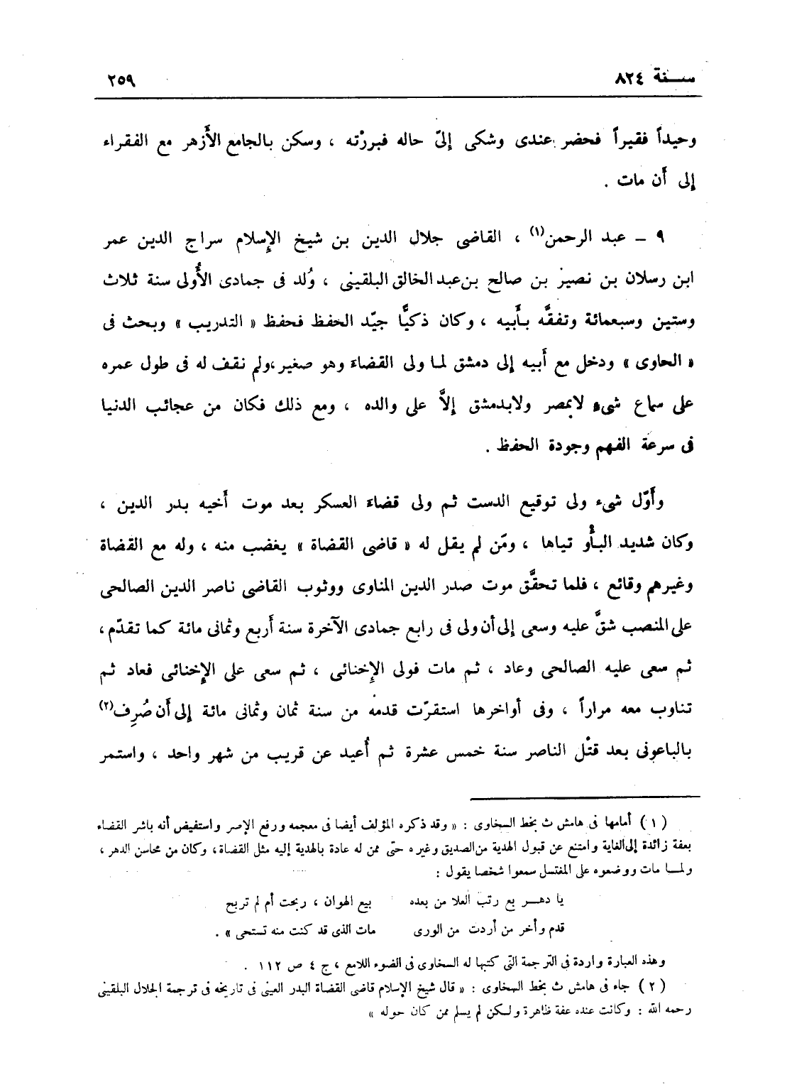 عبد الرحمن القاضي جلال الدين بن شيخ الإسلام سراج الدين عمر بن رسلان بن نصير بن صالح بن عبد الخالق البلقيني، ولد في جمادى سنة ثلاث وستين وسبعمائة وتفقه بأبيه، وكان ذكياً جداً فحفظ التدريب وبحث في الحاوي، ودخل مع أبيه إلى دمشق لما ولى القضاء وهو صغير، ولم يقف له في طول عمره على سماع شيء لا بمصر ولا بدمشق إلا على والده ومع ذلك فكان من عجائب الدنيا في سرعة الفهم وجودة الحافظة، وأول شيء ولى توقيع الدست، ثم ولى قضاء العسكر بعد موت أبيه بدر الدين، وكان شديد البأو تياها، ومن لم يقل له: قاضي القضاة، يغضب منه، وله مع القضاة وغيرهم وقائع، فلما تحقق موت صدر الدين المناوي ووثوب القاضي ناصر الدين ابن الصالحي على المنصب شق عليه وسعى إلى أن ولى في رابع جمادى الآخرة سنة أربع وثمانمائة كما تقدم، ثم سعى عليه الصالحي وعاد ثم مات فولى الإخنائي، ثم سعى على الإخنائي فعاد، ثم تناوب معه مراراً وفي آخرها استقرت قدمه من سنة ثمان وثمانمائة إلى أن صرف بالباعوني بعد قتل الناصر سنة خمس عشرة، ثم أعيد عن قرب من شهر واحد واستمر