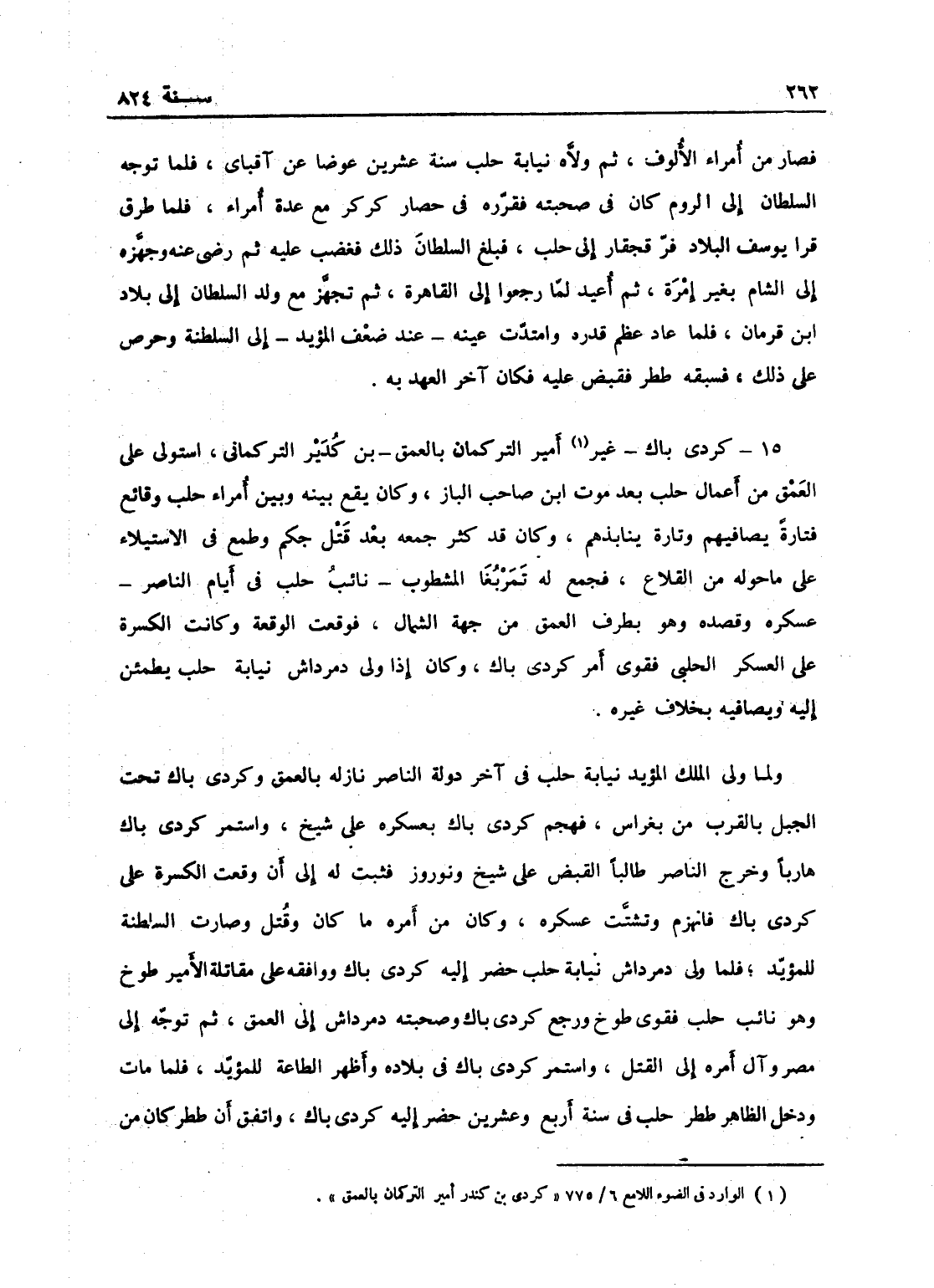 كردى بك أمير التركمان بالعمق ابن كدير التركماني، استولى على العمق من أعمال حلب بعد موت ابن صاحب الباز، وكان يقع بينه وبين أمراء حلب فتارة يصافيهم وتارة ينابذهم، وكان قد كثر جمعه بعد قتل جكم وطمع في الاستيلاء على ما حوله من القلاع فجمع له تمربغا المشطوب نائب حلب في أيام الناصر عسكراً وقصده وهو بطرف العمق من جهة الشمال فوقعت الوقعة، وكانت الكسرة على العسكر الحلبي فقوى تمر كردي بك، وكان إذا ولي دمرداش نيابة حلب يطمئن ويصانعه بخلاف غيره، ولما ولي الملك المؤيد نيابة حلب في أواخر دولة الناصر، نازله بالعمق وكردى بك تحت الجبل بالقرب من بقراس، فهجم كردى بك بعسكره على شيخ، فثبت له إلى أن وقعت الكسرة على عسكر كردى بك فانهزم وتشتت عسكره، واستمر كردى بك هارباً وخرج الناصر طالباً القبض على شيخ ونوروز، فكان من أمره ما كان وقتل وصارت السلطنة للمؤيد، فلما ولي دمرداش نيابة حلب حضر كردى بك ووافقه على معاملة الأمير طوخ وهو نائب حلب، فقوى طوخ ورجع كردى بك وصحبته دمرداش إلى العمق، ثم توجه إلى مصر وآل أمره إلى القتل، واستمر كردى بك في بلاده وأظهر طاعة المؤيد، فلما مات ودخل الظاهر ططر حلب في سنة أربع وعشرين حضر كردى بك، واتفق أن ططر كان من
