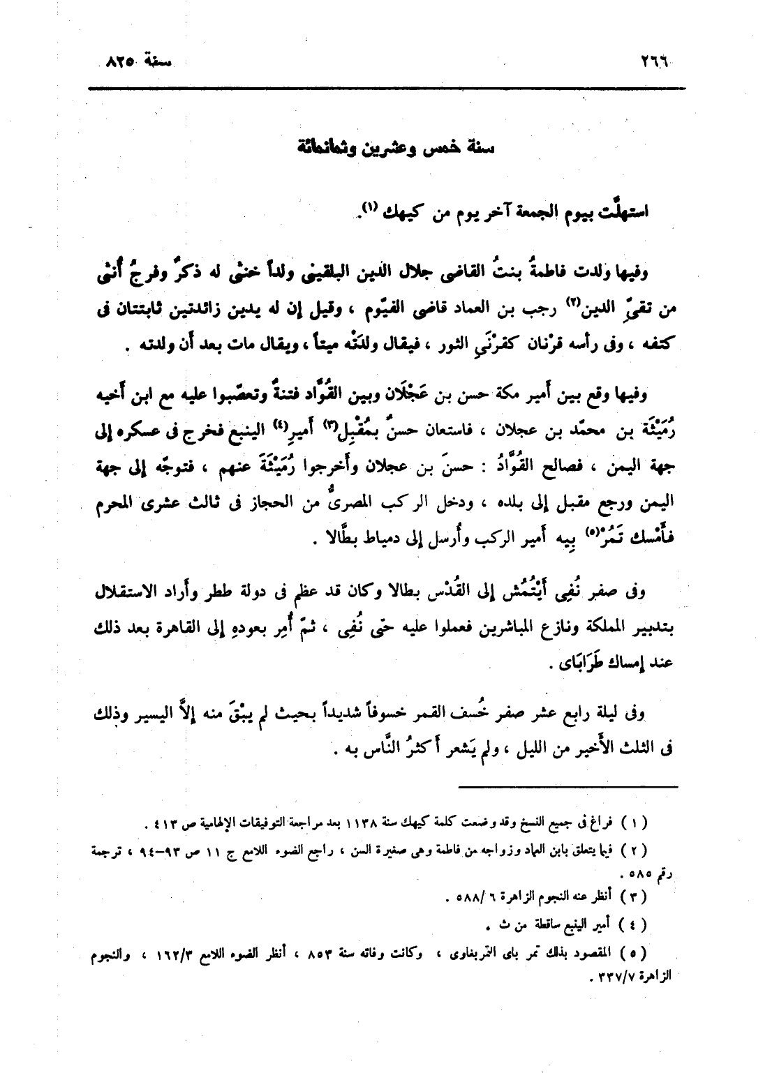 استهلت يوم الجمعة آخر يوم من.... وفيها ولدت فاطمة بنت القاضي جلال الدين البلقيني ولداً خنثى وفرج أنثى من تقي الدين رجب ابن العماد قاضي الفيوم، وقيل إن له يدين زائدتين، نابتتان في كتفيه، وفي رأسه قرنان كقرني الثور، فيقال: ولدته ميتاً، ويقال: بعد أن ولدته.