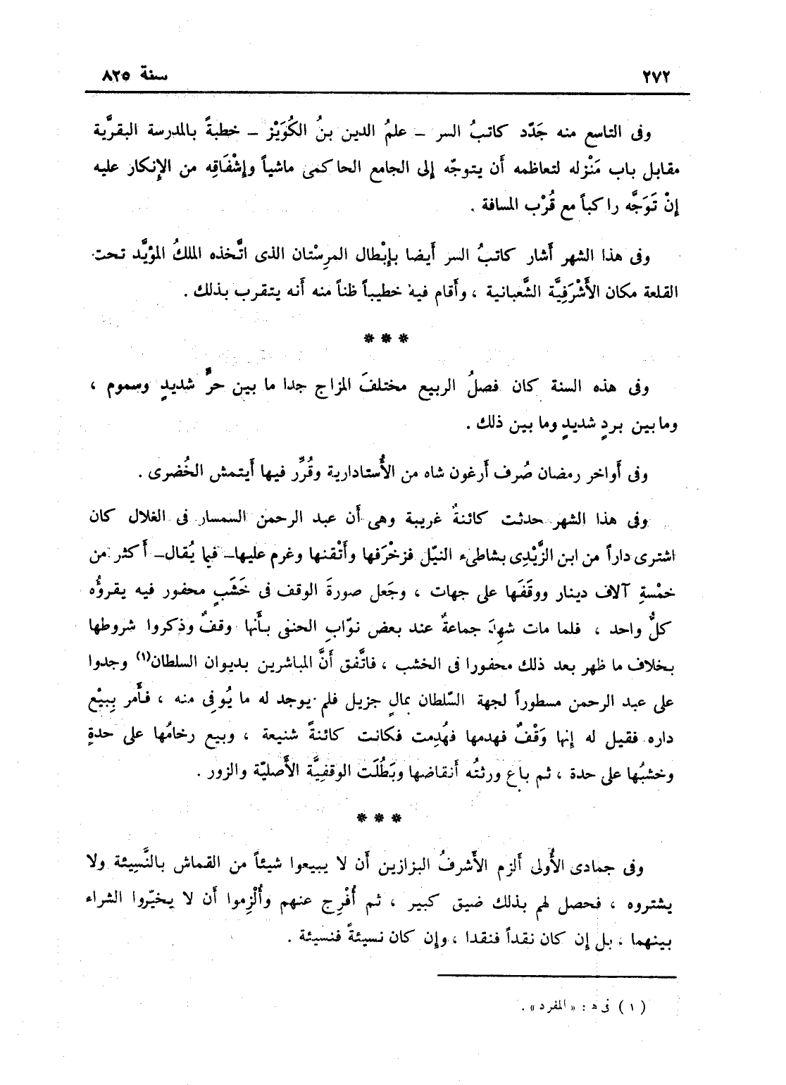 وفي التاسع منه جدد كاتب السر علم الدين ابن الكويز خطبة بالمدرسة البقرية مقابل باب منزله لتعاظمه أن لا يتوجه إلى الجامع الحاكمي ماشياً وإشفاقه من الإنكار عليه أن يتوجه راكباً مع قرب المسافة. وفي هذا الشهر أشار كاتب السر أيضاً بإبطال المارستان الذي أتخذه الملك المؤيد تحت القلعة مكان الأشرفية الشعبانية وأقام فيه خطيباً ظناً منه أنه يتقرب بذلك.