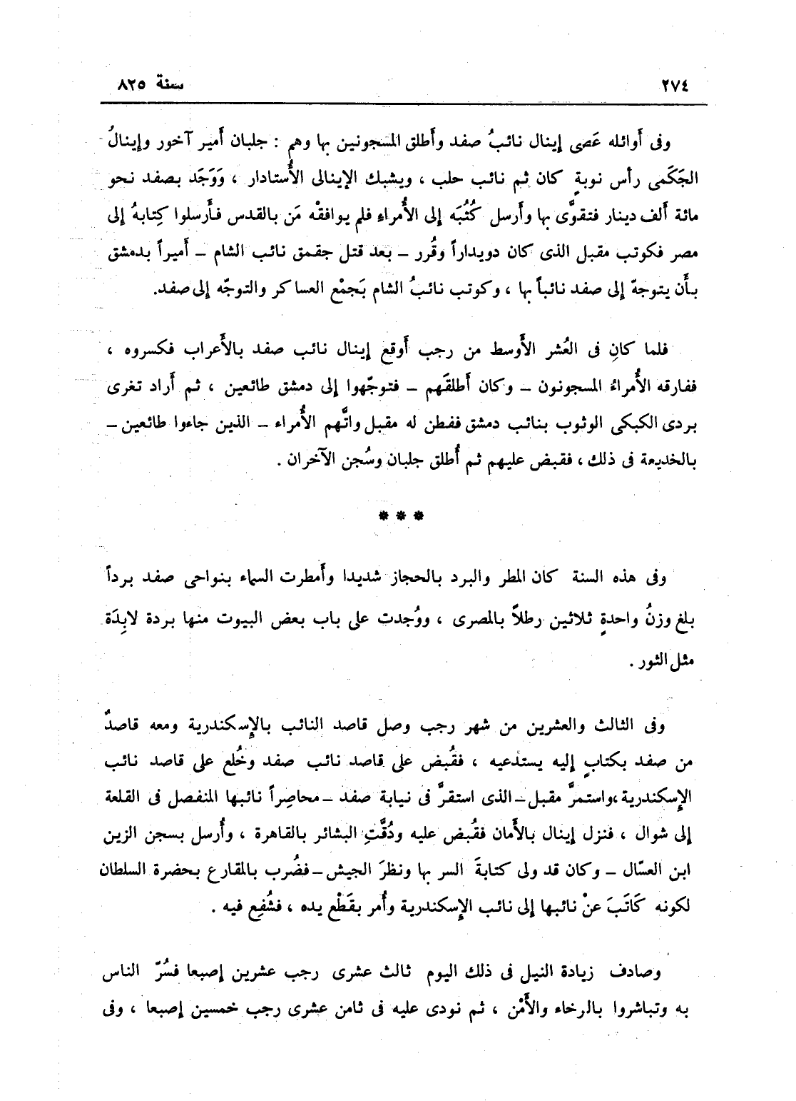 وفي الثالث والعشرين من شهر رجب وصل قاصد النائب بالإسكندرية ومعه قاصد من صفد بكتاب يستدعيه فقبض على قاصد نائب صفد وخلع على قاصد نائب الإسكندرية، واستمر مقبل الذي استقر في نيابة صفد يحاصر نائبها المنفصل في القلعة إلى شوال، فنزل إينال بالأمان، فقبض عليه ودقت البشائر بالقاهرة، وأرسل بشمس الدين ابن العسال وكان قد ولي كتابة السر بها ونظر الجيش، فضرب بالمقارع بحضرة السلطان لكونه كاتب عن نائبها إلى نائب الإسكندرية وأمر بقطع يده فشفع به، وصادف زيادة النيل في ذلك اليوم يعني ثالث رجب عشرين إصبعا فسر الناس به وتباشروا بالرخاء والأمن، ثم نودي عليه في ثامن عشري رجب خمسين إصبعا، وفي