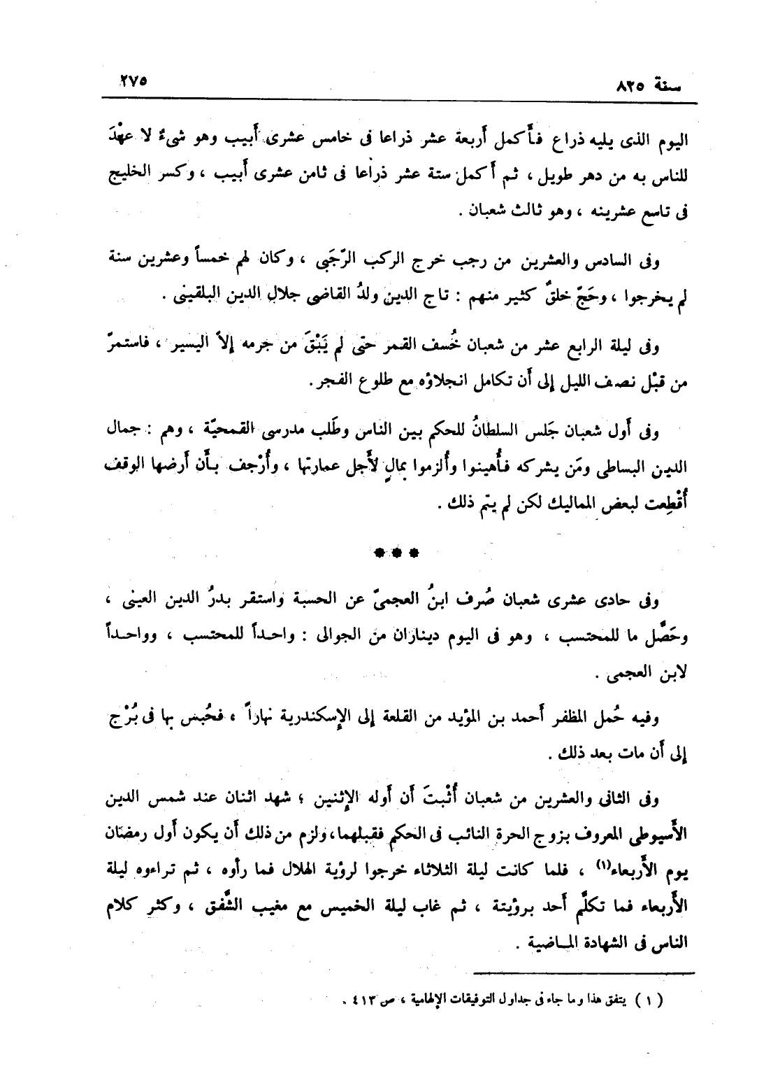 وفي الثاني والعشرين من شعبان أثبت أن أوله الاثنين شهد اثنان عند شمس الدين الأسيوطي المعروف بزوج الحرة النائب في الحكم فقبلهما، ولزم من ذلك أن يكون أول رمضان يوم الأربعاء، فلما كان ليلة الثلثاء خرجوا لترائي الهلال فما رأوا، ثم تراءوا ليلة الأربعاء فلما تكلم أحد برؤيته، ثم غاب ليلة الخميس مع مغيب الشفق وكثر كلام الناس في الشهادة الماضية.