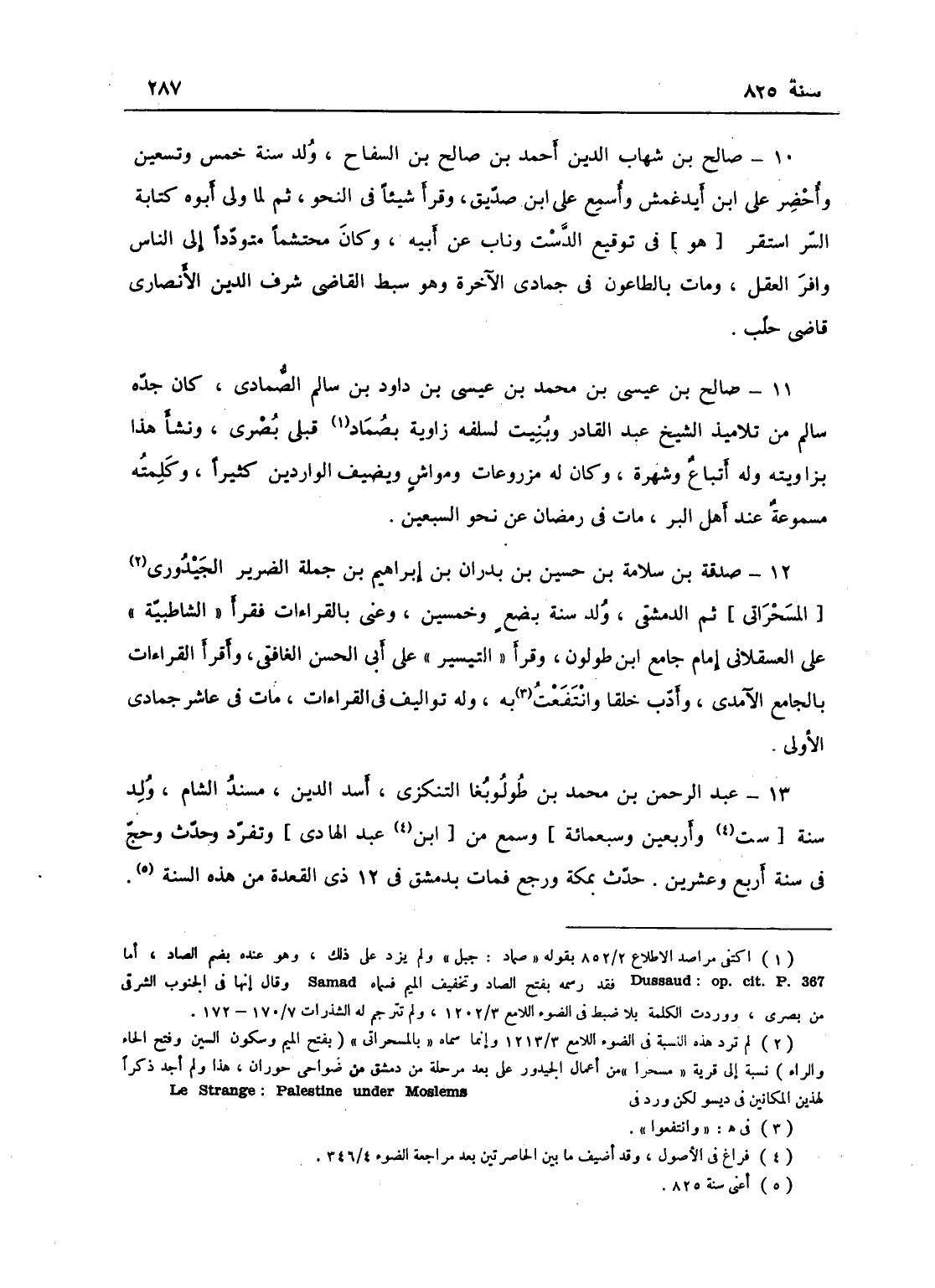 صالح بن عيسى بن محمد بن عيسى بن داود بن سالم، الصمادي كان جده سالم من تلامذة الشيخ عبد القادر، وبنيت لسلفه زاوية بصماد قبلي بصرى ونشأ هذا بزاويته، وله أتباع وشهرة، وكان له مزدرعات ومواشي ويضيف الواردين كثيراً، وكلمته مسموعة عند أهل البر؛ ومات في رمضان عن نحو السبعين.