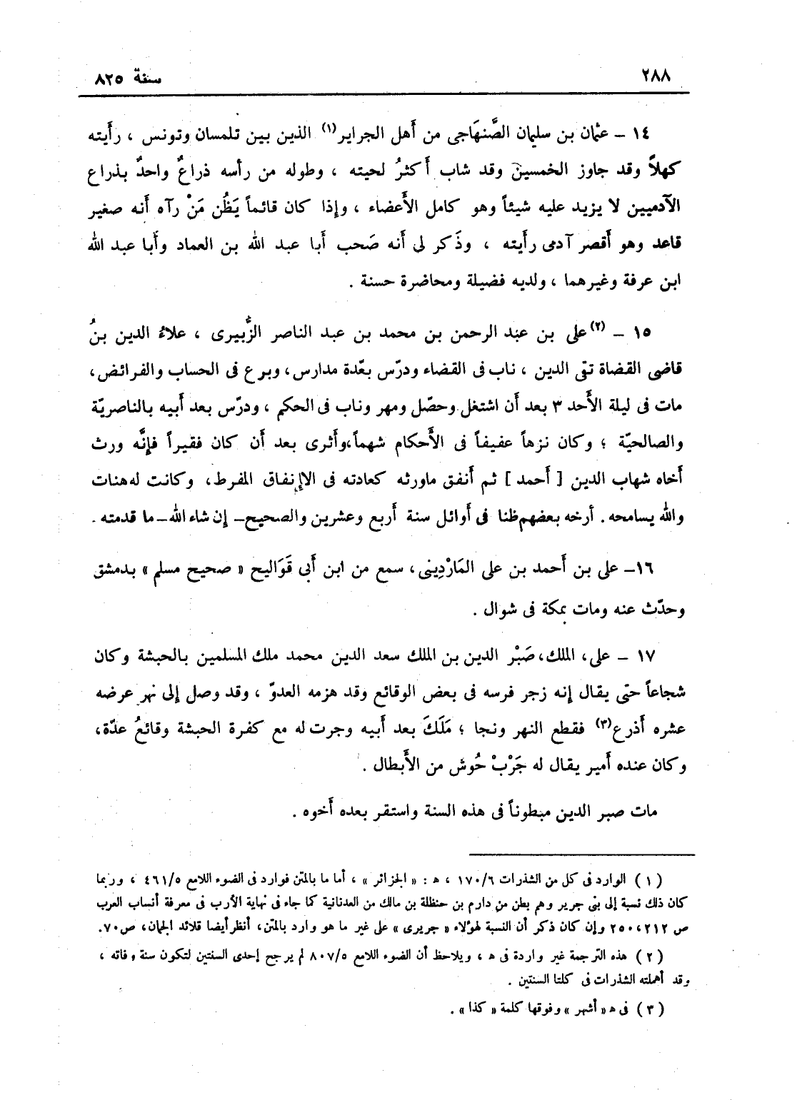 علي الملك صير الدين بن الملك سعد الدين محمد، ملك المسلمين بالحبشة وكان شجاعاً حتى يقال إنه زجر فرسه في بعض الوقائع وقد هزمه العدو وقد وصل إلى نهر عرضه عشرة أذرع فقطع النهر ونجا ملك بعد أبيه، وجرت له مع كفرة الحبشة وقائع عدة، وكان عنده أمير يقال له حرب جوس من الأبطال: مات صير الدين مبطوناً في هذا السنة، واستقر بعده أخوه