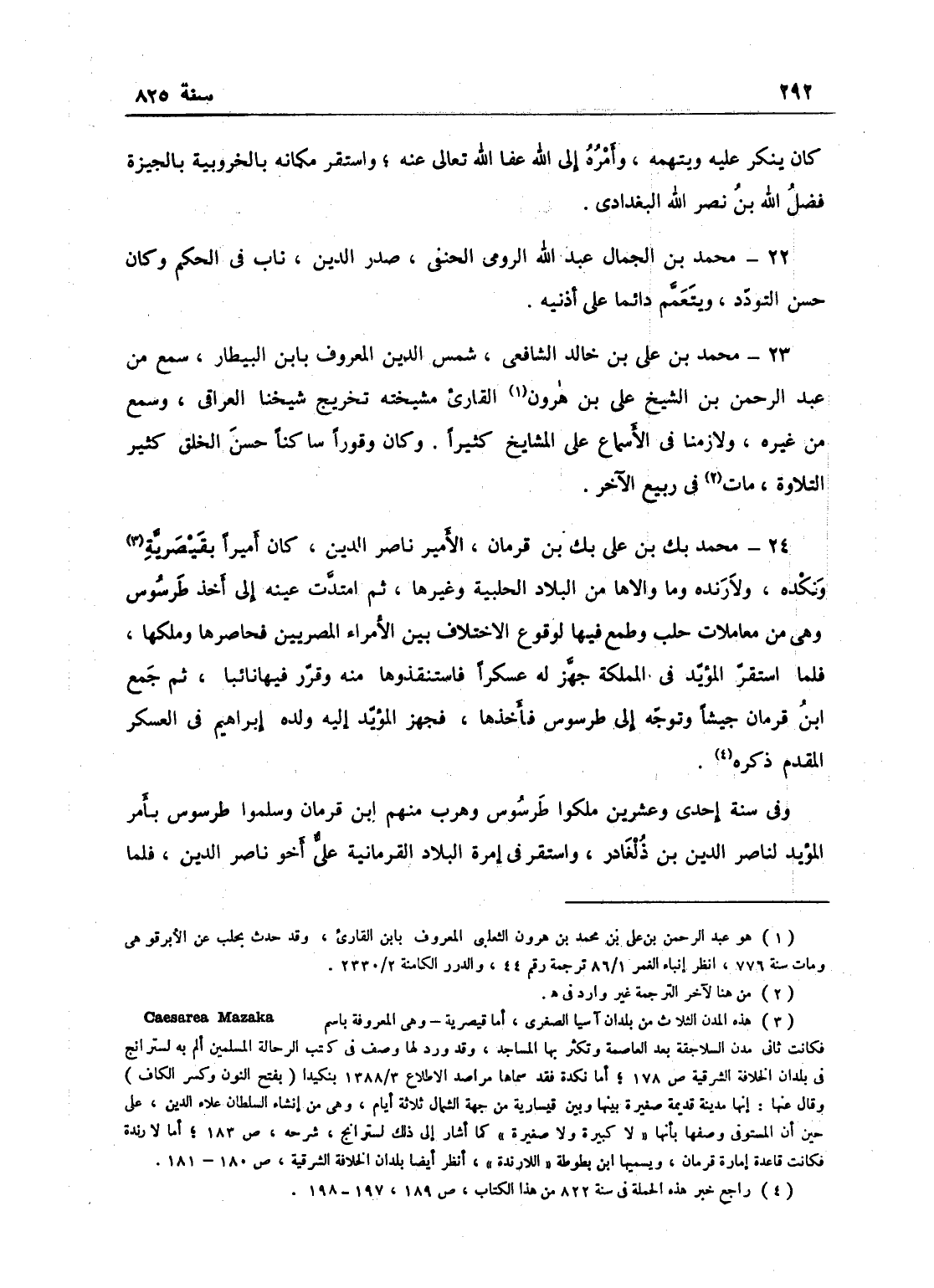 محمد بن علي بن قرمان، الأمير ناصر الدين، كان أمير بقصرية ونكدة ولا رندة، وما والاها من البلاد الحلبية غيرها، ثم امتدت عينه إلى أخذ طرسوس وهو من معاملات حلب، وطمع فيها لوقوع الاختلاف بين الأمراء المصرية فحاصرها وملكها، فلما استقر المؤيد في المملكة جهز عسكراً فاستنقذها منه وقرر فيها نائباً، ثم جمع ابن قرمان جيشاً وتوجه إلى طرسوس فأخذها. فجهز المؤيد ولده إبراهيم في العسكر المقدم ذكره في سنة إحدى وعشرين فملكوا طرسوس وهرب منهم ابن قرمان، وسلموا طرسوس بأمر المؤيد لناصر الدين بن دلغادر.