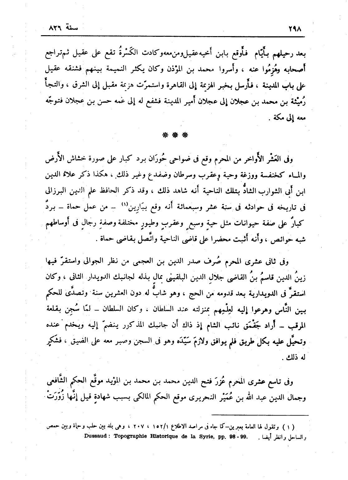 وفي العشر الأواخر من المحرم وقع بنواحي حوران برد كبار على صور خشاش الأرض والماء، كخنفسة ووزعة وحية وعقرب وسرطان وضفدع وغير ذلك - هكذا ذكر علاء الدين ابن أبي الشوارب الشاد بتلك الناحية أنه شاهد ذلك، وقد ذكر الحافظ علم الدين البرزالي في تاريخه في حوادث سنة ست عشرة وسبعمائة أنه وقع ببارين من عمل حماة برد كبار على صفة حيوانات مثل حية وسبع وعقرب وطيور مختلفة وصفة رجال في أوساطهم شبه حوائص، وأنه ثبت بمحضر على قاضي الناحية واتصل بقاضي حماة.
