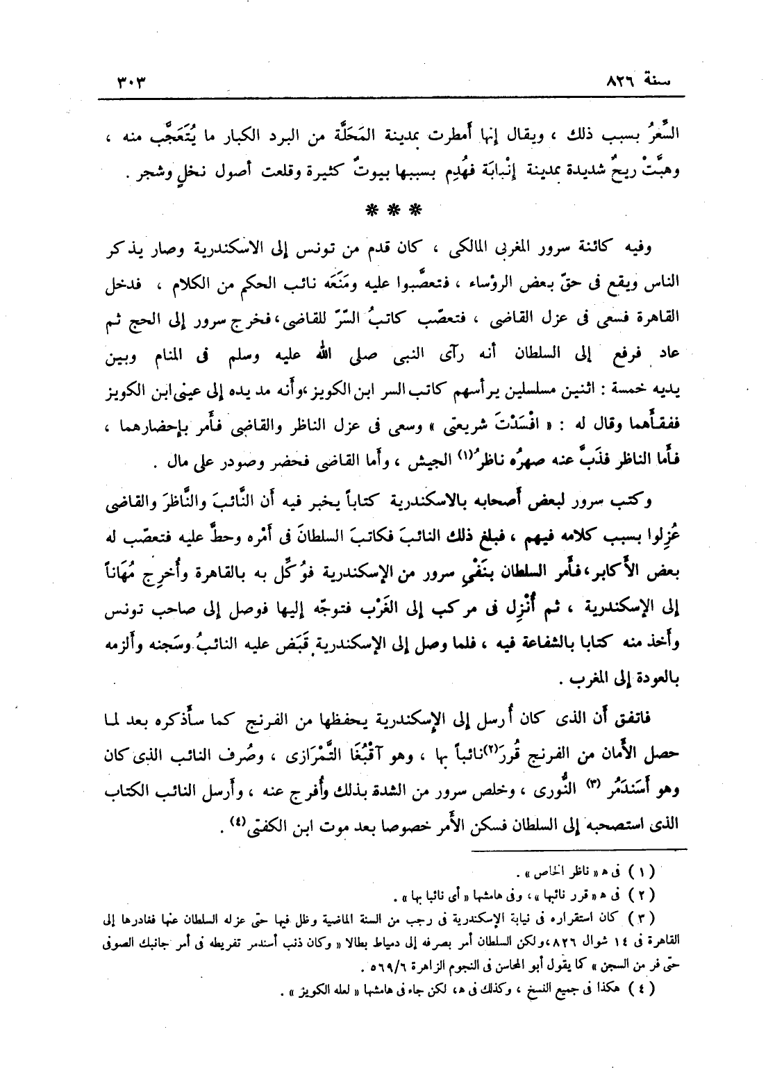 وفيه كائنة سرور المغربي المالكي، كان قدم من تونس إلى الإسكندرية وصار يذكر الناس ويقع في حق بعض الرؤساء، فتعصبوا عليه ومنعه نائب الحكم من الكلام، فدخل القاهرة فسعى في عزل القاضي، فتعصب كاتب السر للقاضي، فخرج سرور إلى الحج ثم عاد فرفع إلى السلطان أنه رأى النبي صلى الله عليه وسلم في المنام وبين يديه خمسة أنفس مسلسلين رأسهم كاتب السر ابن الكويز، وأنه مد يده إلى عيني ابن الكويز ففقاهما وقال له: أفسدت شريعتي! وسعى في عزل الناظر والقاضي فأمر بإحضارهما، فأما الناظر فذب عنه صهره ناظر الخاص، وأما القاضي فحضر وصودر على مال، وكتب سرور لبعض أصحابه بالإسكندرية كتاباً يخبر فيه أن النائب والناظر والقاضي عزلوا بسبب كلامه فيهم، فبلغ ذلك النائب فكاتب السلطان في أمره وحط عليه، فتعصب له بعض الأكابر فأمر السلطان بنفي سرور من الإسكندرية، فوكل به بالقاهرة وأخرج مهاناً إلى الإسكندرية، ثم أنزل في مركب إلى الغرب فتوجه إليها، فوصل إلى صاحب تونس وأخذ منه كتاباً بالشفاعة فيه، فلما وصل إلى الإسكندرية قبض عليه النائب وسجنه وألزمه بالعود إلى الغرب، فاتفق أن الذي كان أرسل إلى الإسكندرية يحفظها من الفرنج كما سأذكره بعد، لما حصل الأمن من الفرنج قرر نائبها وهو آقبغا التمرازي وصرف النائب الذي كان بها وهو أسندمر النوري، وخلص سرور من الشدة بذلك وافرج عنه، وأرسل النائب الكتاب الذي استصحبه إلى السلطان، فسكن الأمر خصوصاً بعد موت ابن الكويز.