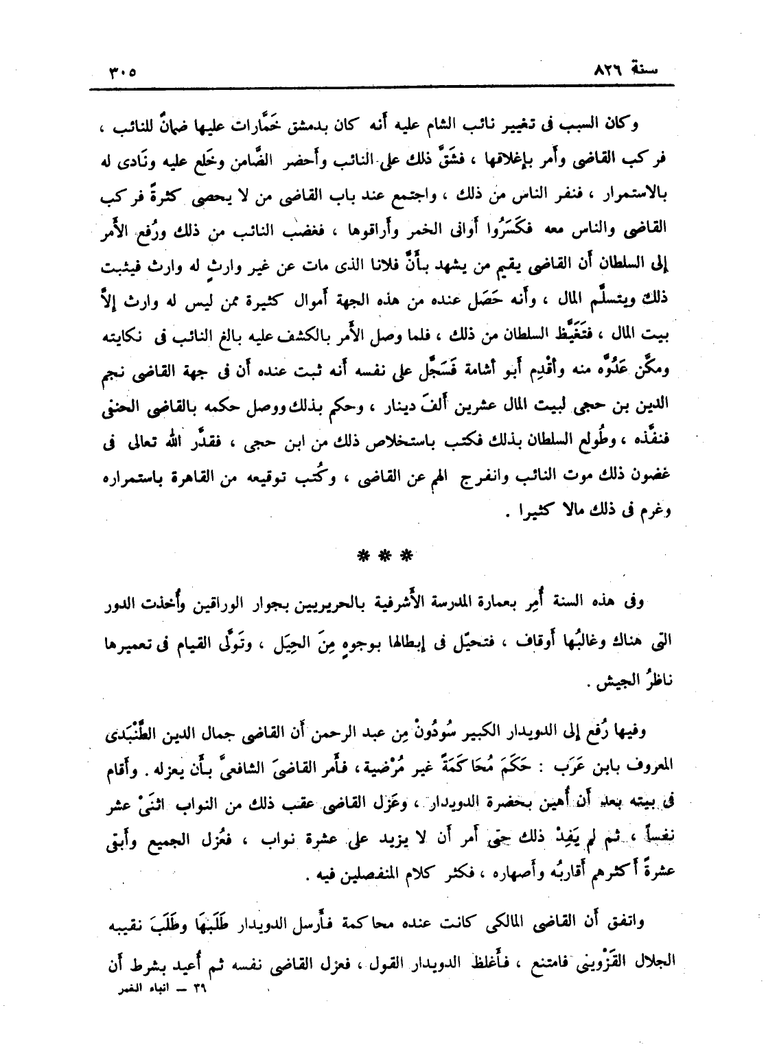 وفي هذه السنة ابتدئ بعمارى المدرسة الأشرفية بالحريرين بجوار الوارقين، وأخذت الدور التي هناك وغالبها أوقاف، فتحيل في إبطالها بوجوه من الحيل، وتولى القيام في تعميرها ناظر الجيش عبد الباسط، وفيه رفع إلى الدوادار الكبير سودون من عبد الرحمن أن القاضي جمال الدين الطنبذي المعروف بابن عرب حكم محاكمة غير مرضية، فأمر القاضي الشافعي بأن يعزله، واقام في بيته بعد أن أهين بحضرة الدوادار، وعزل القاضي عقب ذلك من النواب اثني عشر نفساً، ثم لم يفد ذلك حتى أمر أن لا يزيد على عشرة نواب فعزل الجميع، وانتقى عشرى أكثرهم أقاربه واصهاره، فكثر كلام المنفصلين فيه، واتفق أن القاضي المالكي كانت عنده محاكمة فأرسل الدوادار طلبها وطلب نقيبه الجلال القزويني فامتنع، فأغلظ الدوادار القول، فعزل القاضي نفسه، ثم أعيد بشرط أن