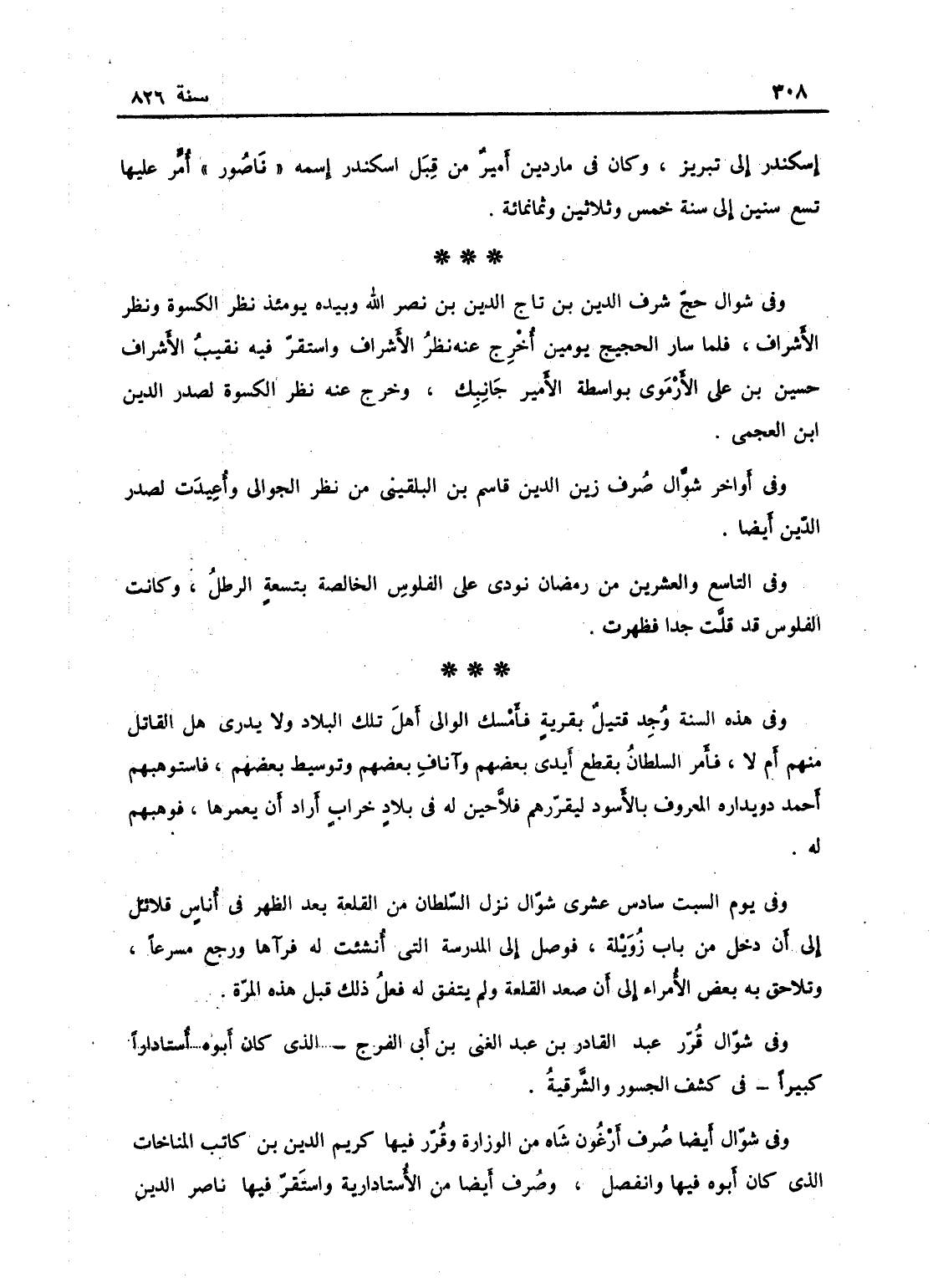 وفي شوال قرر عبد القادر بن عبد الغني بن أبي الفرج الذي كان أبوه أستادارا كبيراً في كشف الجسور والشرقية، وفي شوال أيضاً صرف أرغون شاه من الوزارة، وقرر فيها كريم الدين ابن كاتب المناخات الذي كان أبوه فيها وانفصل، وصرف أيضاً من الأستادارية، واستقر فيها ناصر الدين