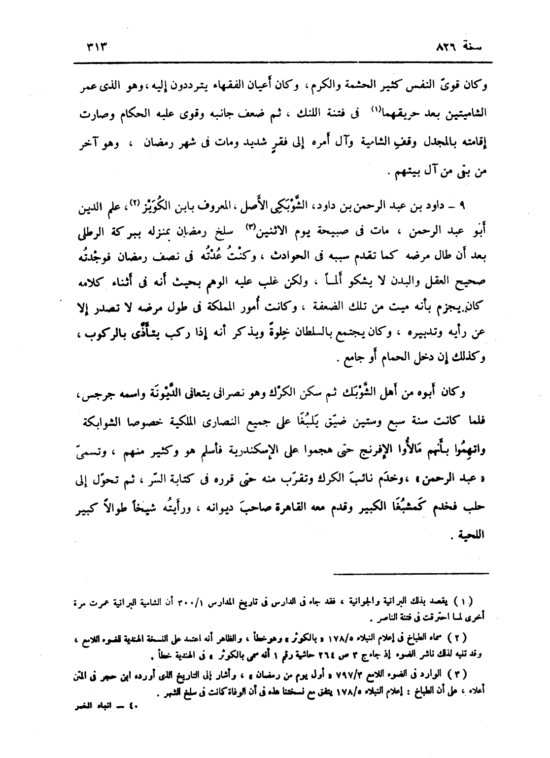 داود بن عبد الرحمن بن داود، الشوبكي الأصل المعروف بابن الكويز علم الدين أبو عبد الرحمن. مات في صبيحة يوم الاثنين سلخ رمضان بمنزله ببركة الرطلي بعد أن طال مرضه كما تقدم سببه في الحوادث. وكنت عدته في نصف رمضان فوجدته صحيح العقل والبدن لا يشكو ألماً ولكنه غلب عليه الوهم بحيث أنه في أثناء كلامه كان يجزم بأنه ميت من تلك الضعفة، وكانت أمور المملكة في طول مدة مرضه لا تصدر إلا عن رأيه وتدبيره، وكان يجتمع بالسلطان خلوة ويذكر أنه إذا ركب يتأذى بالركوب كذلك إن دخل الحمام أو الجامع كان أبوه من أهل الشوبك ثم سكن الكرك وهو نصراني يتعانى الديونة واسمه جرجس، فلما كان سنة سبع وستين ضيق يلبغا على جميع النصارى الملكية خصوصاً الشوابكة واتهموا بأنهم مالؤا الإفرنج على الإسكندرية، فأسلم هو وكثير منهم وتسمى عبد الرحمن، وخدم نائب الكرك وتقرب منه حتى قرره في كتابه السر، ثم تحول إلى حلب فخدم كمشبغا الكبير وقدم معه القاهرة صاحب ديوانه، ورأيته شيخاً طوالا كبير اللحية،