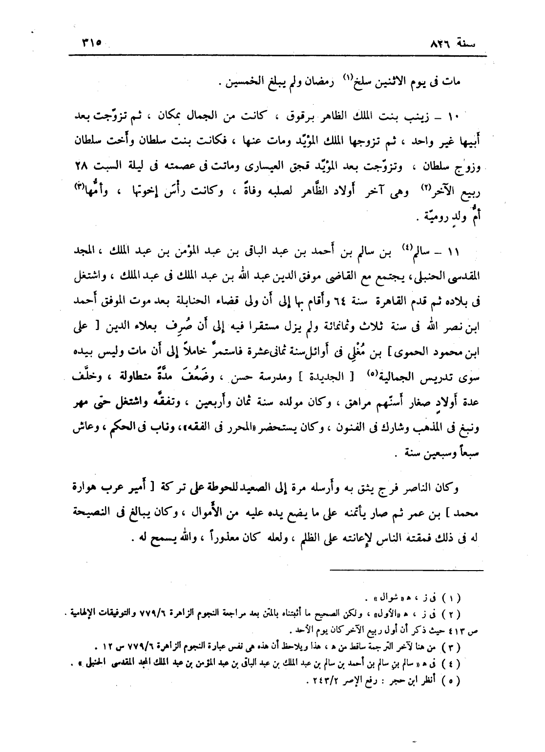 زينب بنت الملك الظاهر برقوق، كانت من الجمال بمكان ثم تزوجت بعد أبيها ... ثم تزوجها ... ثم تزوجها الملك المؤيد ومات عنها، فكانت بنت سلطان وأخت سلطان وزوج سلطان، وتزوجت بعد المؤيد قجق العيساوي، وماتت في عصمته في ليلة السبت 28 ربيع الأول، وهي آخر أولاد الظاهر لصلبه وفاة، وكانت أرأس إخوتها، وأمها أم ولد رومية.