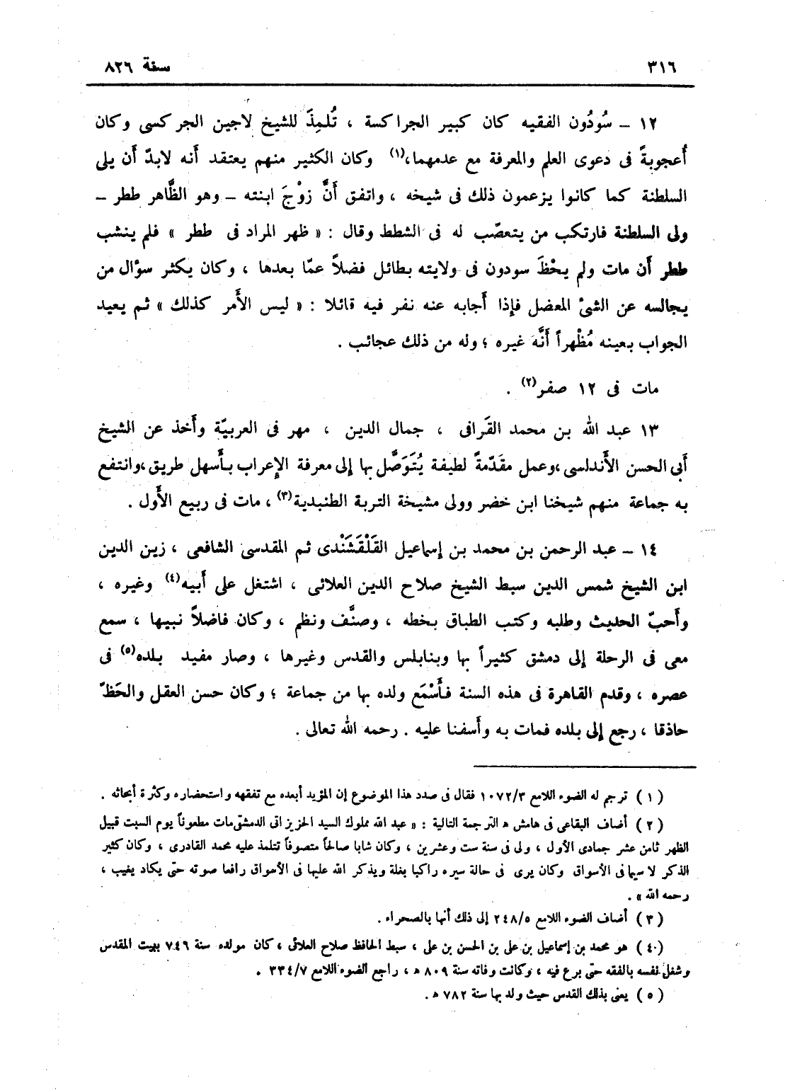عبد الرحمن بن محمد بن إسماعيل، القلقشندي ثم القدسي زين الدين إبن الشيخ شمس الدين سبط الشيخ صلاح الدين العلائي، اشتغل على أبيه وغيره، وأحب الحديث وطلبه، وكتب الطباق بخطه، وصنف ونظم، وكان فاضلا نبيها، سمع معي في الرحلة إلى دمشق كثيراً بها وبنابلس والقدس وغيرهما، وصار مفيد بلده في عصره، وقدم القاهرة في هذه السنة فأسمع ولده بها من جماعة، وكان حسن العقل والخط حاذقاً، رجع إلى بلده فمات بها وأسفنا عليه - رحمة الله تعالى.