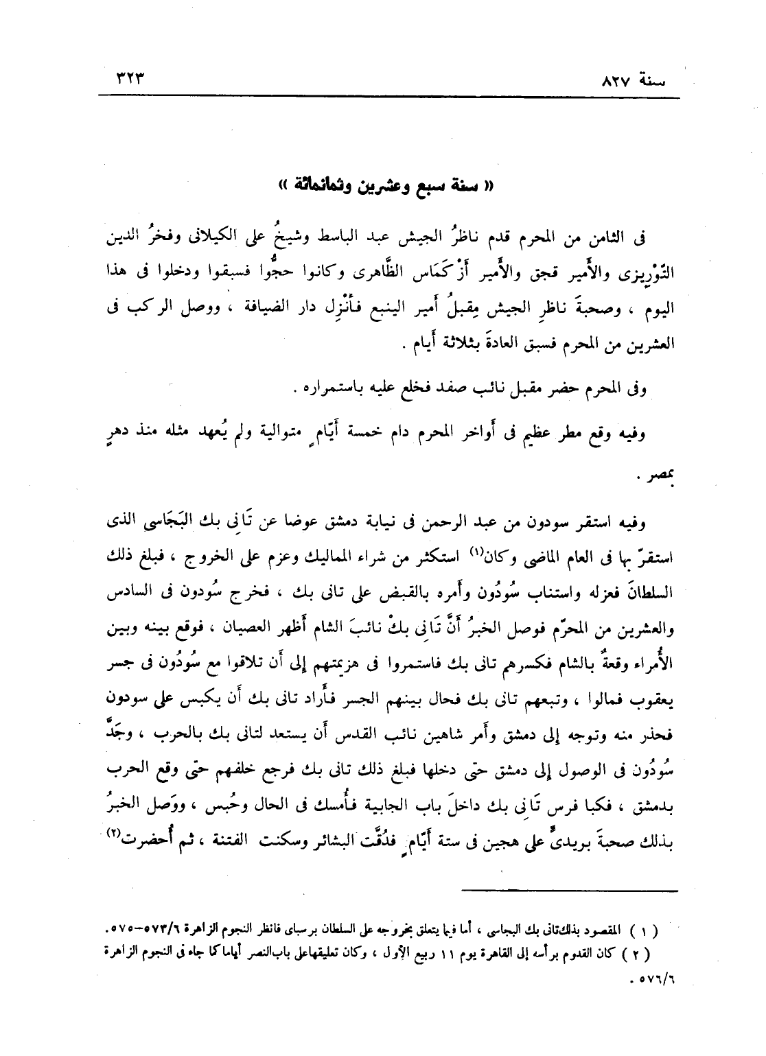 وفيه استقر سودون من عبد الرحمن في نيابة دمشق عوضاً عن تاني بك البجاسي الذي استقر بها في العام الماضي، وكان استكثر من شراء المماليك وعزم على الخروج فبلغ ذلك السلطان، فعزله واستناب سودون وأمره بالقبض على تاني بك، فخرج سودون في السادس والعشرين من المحرم، فوصل الخبر بأن تاني بك نائب الشام أظهر العصيان، فوقع بينه وبين الأمراء بالشام وقعة فكسرهم تاني بك، فاستمروا في هزيمتهم إلى أن تلاقوا مع سودون في جسر يعقوب فمالوا وتبعهم تاني بك فحال بينهم الجسر، فأراد تاني بك أن يكبس على سودون فحذر منه وتوجه إلى دمشق وأمر شاهين نائب القدس أن يستعد لتاني بك بالحرب، وجد سودون في الوصول إلى دمشق حتى دخلها، فبلغ ذلك تاني بك فرجع خلفهم حتى وقع الحرب بدمشق، فكبا فرس تاني بك داخل باب الجابية فأمسك في الحال وحبس، ووصل الخبر بذلك صحبة على هجين في ستة أيام، فدقت البشائر، وسكنت الفتنة، ثم أحضرت