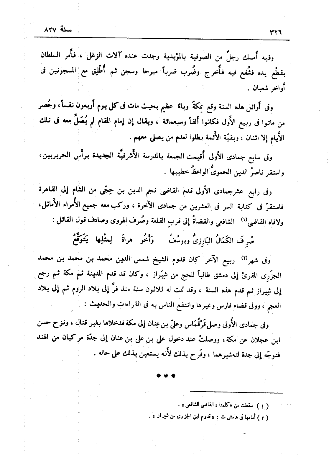 وفي شهر ربيع الآخر كان قدوم الشيخ شمس الدين محمد بن محمد بن محمد الجزري المقرئ إلى دمشق طالبا للحج من شيراز، وكان قد قدم المدينة ثم مكة ورجع إلى شيراز، ثم قدم هذه السنة وقد تمت له ثلاثون سنة منذ فر إلى بلاد الروم ثم إلى بلاد العجم، وولى قضاء فارس وغيرها، وانتفع الناس به في القراآت والحديث.