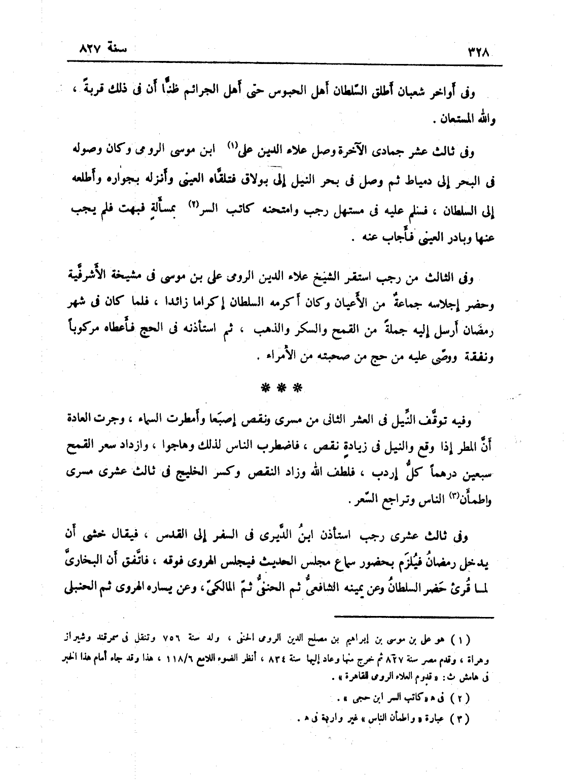 وفي أواخر شعبان أطلق السلطان أهل الحبوس حتى أهل الجرائم ظناً أن في ذلك قربة فالله المستعان! وفي ثالث عشر جمادى الآخرة وصل علاء الدين علي بن موسى الرومي، وكان وصوله في البحر إلى دمياط ثم وصل في بحر النيل إلى بولاق، فتلقاه العيني وأنزله بجواره وأطلعه إلى السلطان فسلم عليه في مستهل رجب، وامتحنه كاتب السر بمسألة فبهت فلم يجب عنها، وبادر العيني فأجاب عنه.