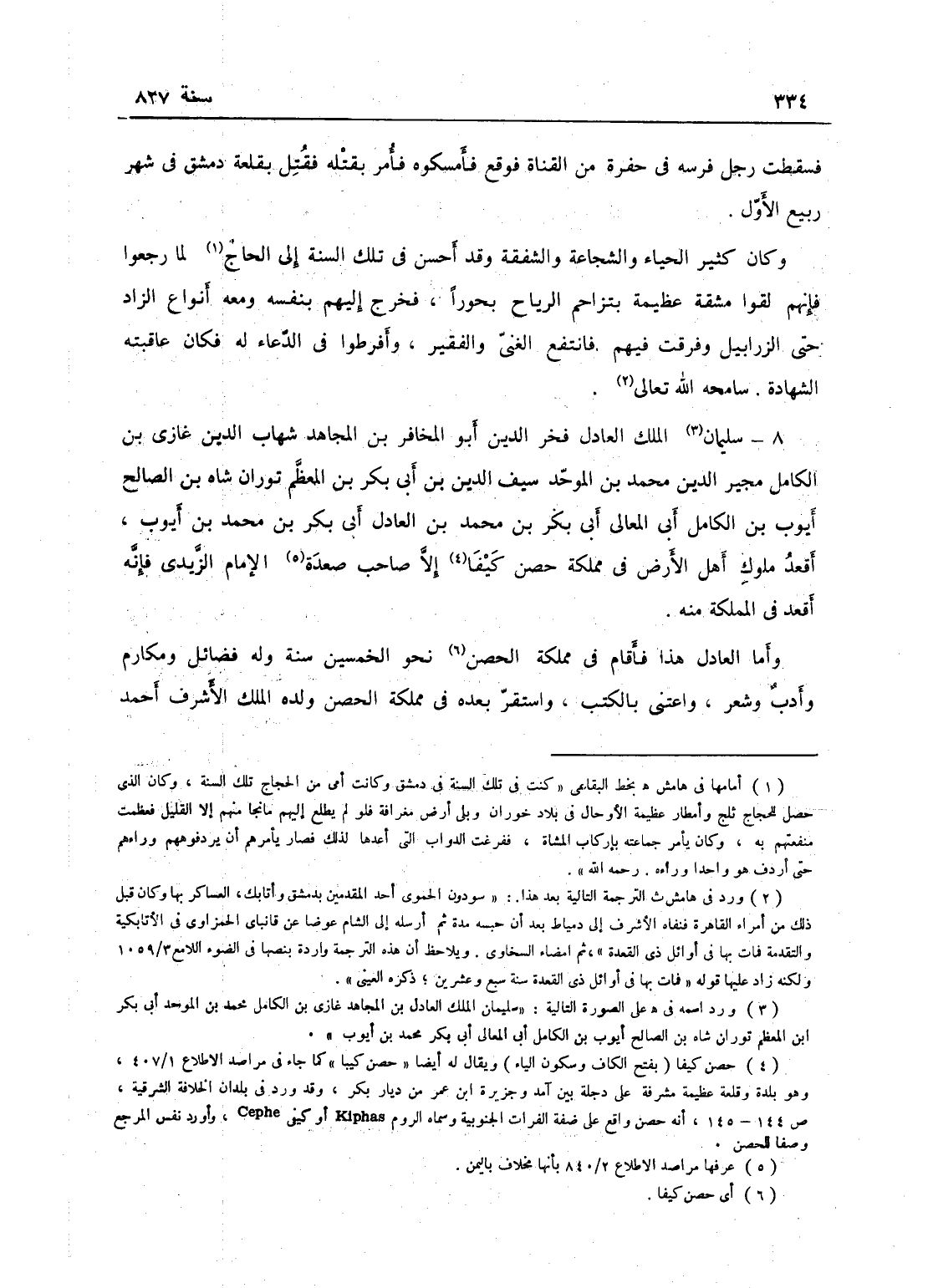 سليمان الملك العادل بن المجاهد غازي بن الكامل محمد بن الموحد أبي بكر بن المعظم توران شاه بن الصالح أيوب بن الكامل أبي المعالي أبي بكر محمد بن أيوب أقعد ملوك الأرض في مملكة حصن كيفا إلا صاحب صعدة الإمام الزيدي فإنه أقعد في المملكة منه، وأما العادل هذا فأقام في مملكة الحصن نحو الخمسين سنة، وله فضائل ومكارم وأدب وشعر واعتناء بالكتب والآداب، واستقر بعده في مملكة الحصن ولده الملك الأشرف أحمد