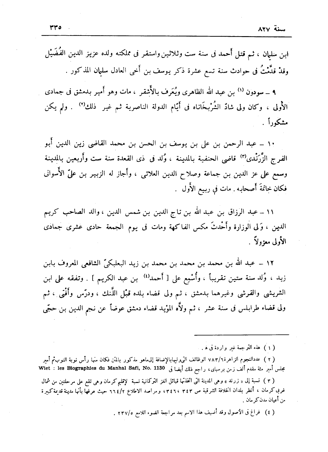 عبد الله بن محمد بن محمد بن محمد بن زيد، البعلبكي المعروف بابن زيد، ولد سنة ستين تقريباً، وأسمع على ... وتفقه على ابن الشريشي والقرشي وغيرهما بدمشق، ثم ولي قضاء بلدة قبل اللنك ودرس وأفتى، ثم ولي قضاء طرابلس في سنة عشر، ثم ولاه المؤيد قضاء دمشق عوضاً عن نجم الدين بن حجى