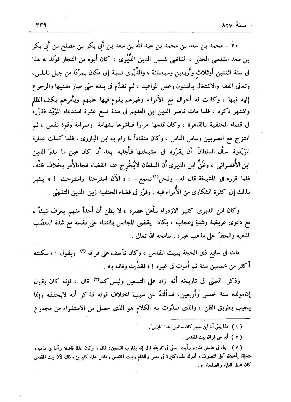 محمد بن عبد الله بن سعد بن أبي بكر بن مصلح بن أبي بكر بن سعد، المقدسي الحنفي، القاضي شمس الدين ابن الديري، كان أبوه من التجار فولد له هذا في سنة إثنتين أو ثلاث وأربعين وسبعمائة، والديري نسبة إلى مكان ببردا من جبل نابلس، وتعانى الفقه والاشتغال في الفنون وعمل المواعيد، ثم تقدم في بلده حتى صار مفتيها والمرجوع إليه فيها، وكانت له أحوال مع الأمراء وغيرهم يقوم فيها عليهم ويأمرهم بكف الظلم واشتهر ذكره، فلما مات ناصر الدين بن العديم في سنة تسع عشرة استدعاه المؤيد فقرره في قضاء الحنفية بالقاهرة وكان قدمها مراراً، فباشرها بشهامة وصرامة وقوة نفس، ثم انمزج مع المصريين وساس الناس، وكان منقاداً لما رام به منه ابن البارزي، فلما كملت عمارة المؤيدية سأل السلطان أن يقرره في مشيختها، فأجابه بعد أن كان عين لها بدر الدين ابن الأقصراني، وظن ابن الديري أن السلطان لايخرج عنه القضاء فجاء الأمر بخلاف ظنه، فلما قرره في المشيخة قال له - ونحن نسمع: الآن استرحنا واسترحت - يشير بذلك إلى كثرة الشكاوى من الأمراء فيه، وقرر في قضاء الحنفية القاضي زين الدين التفهني، وكان ابن الديري كثير الإزدراء بأهل عصره، لا يظن أن أحداً منهم يعرف شيئا مع دعوى عريضة وشدة إعجاب، يكاد يقضي المجالس بالثناء على نفسه، مع شدة التعصب لمذهبه والحط على مذهب غيره - سامحه الله تعالى! مات في سابع ذي الحجة ببيت المقدس. وكان يأسف على فراقه يقول: سكنته أكثر من خمسين سنة ثم أموت في غيره! فقدرت وفاته به. وذكر العيني في تاريخه أنه زاد على التسعين، وليس كما قال فإنه كان يقول إن مولده سنة خمس وأربعين، فسألته عن سبب إختلاف قوله فذكر أنه لا يحققه وإنما يجيب بطريق الظن، والذي صدرت به الكلام هو الذي حصل من الإستقراء من مجموع