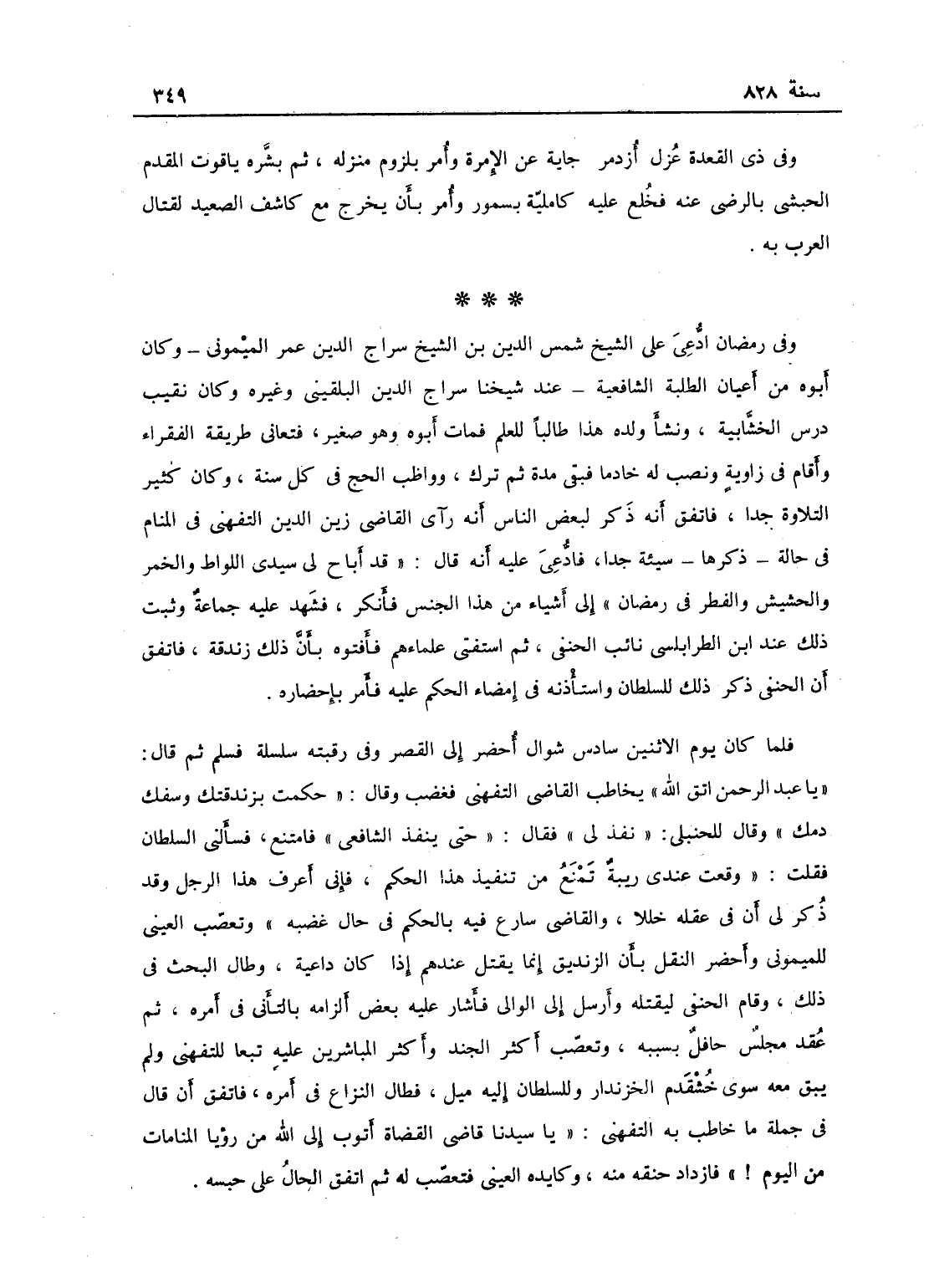 وفي رمضان ادعى على الشيخ شمس الدين بن الشيخ سراج الدين عمر الميموني، وكان أبوه من أعيان الطلبة الشافعية عند شيخنا سراج الدين البلقيني وغيره، وكان نقيب درس الخشابية، ونشأ ولده هذا طالباً للعلم فمات أبوه وهو صغير، فتعاني طريقة الفقراء وأقام في زاوية ونصب له خادماً فبقي مدة، ثم ترك وواظب الحج في كل سنة، وكان كثير التلاوة جداً؛ فاتفق أنه ذكر لبعض الناس أنه رأى زين الدين التفهني في المنام في حالة ذكرها سيئة جداً، فادعى عليه أنه قال: قد أباح لي سيدي اللواط والخمر والحشيش والفطر في رمضان - إلى أشياء من هذا الجنس، فأنكر، فشهد عليه جماعة وثبت ذلك عن ابن الطرابلسي نائب الحنفي، ثم استفتى علماءهم فأفتوه بأن ذلك زندقة، فاتفق أن الحنفي ذكر ذلك للسلطان واستأذنه في إمضاء الحكم عليه فأمر بإحضاره، فلما كان يوم الاثنين سادس شوال أحضر إلى القصر وفي رقبته سلسلة فسلم ثم قال: يا عبد الرحمن اتق الله - يخاطب القاضي التفهني؛ فغضب وقال: حكمت بزندقتك وسفك دمك؟ وقال للحنبلي: نفذ لي، فقال: حتى ينفذ الشافعي؟ فامتنع، فسألني السلطان فقلت: وقعت عندي ريبة تمنع من تنفيذ هذا الحكم، فإني أعرف هذا وقد ذكر لي أن في عقله خللاً والقاضي سارع بالحكم في حال غضبه وتعصب العين للميموني وأحضر النقل بأن الزنديق إنما يقتل عندهم إذا كان داعية، وطال البحث في ذلك. وقام الحنفي ليقتله وأرسل إلى الوالي، فأشار عليه بعض ألزامه بالتأني في أمره، ثم عقد مجلس حافل بسببه وتغضب أكثر الجند وأكثر المباشرين عليه تبعاً للتفهني، ولم يبق معه سوى خشقدم الخازندار وللسلطان إليه ميل، فطال النزاع في أمره فاتفق أن قال في جملة ما خاطب به للتفهني: يا سيدنا قاضي القضاة؟ أتوب إلى الله من رؤيا المنامات من اليوم، فازداد حنقه منه، وكايده العيني فتعصب له، ثم اتفق الحال على حبسه،
