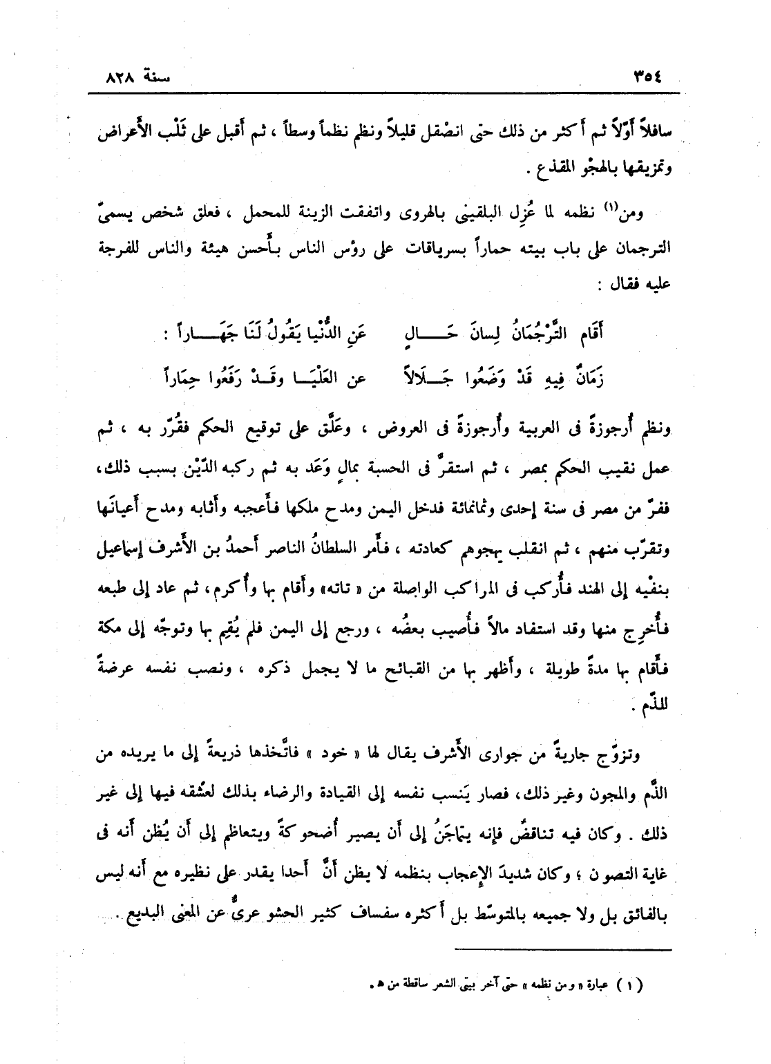 سافلاً أولاً ثم أكثر من ذلك حتى انصقل قليلاً ونظم نظماً وسطاً، ومن نظمه لما عزل البلقيني بالهروي واتفقت الزينة للمحمل فعلق شخص يسمى الترجمان على باب داره بالجنميين حماراً بسرياقات على رؤوس الناس بأحسن هيئة وتردد الناس للفرجة عليه فقال: