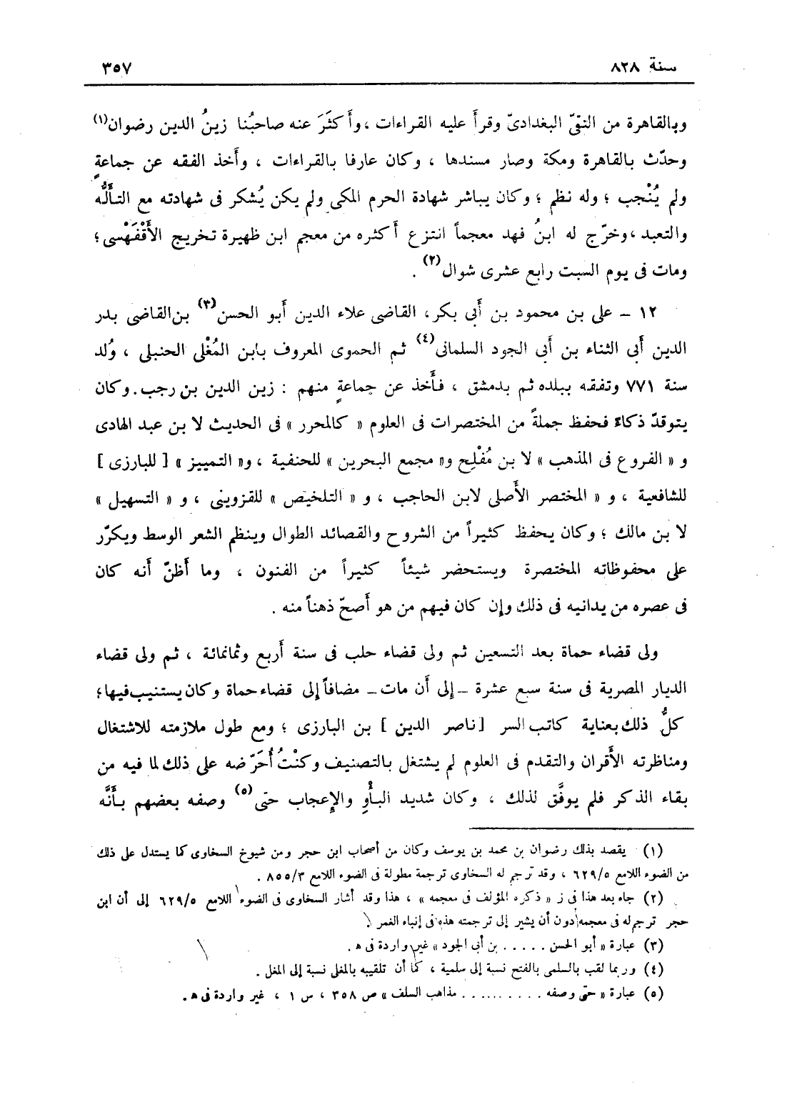 علي بن محمود بن أبي بكر، القاضي علاء الدين، السلماني ثم الحموي، المعروف بابن المغلي، الحنبلي، ولد سنة 771، وتفقه ببلده ثم بدمشق، فاخذ عن جماعة منهم زين الدين ابن رجب، وكان يتوقد ذكاء فحفظ جملة من المختصرات في العلوم، كالمحرر في الحديث لابن عبد الهادي، والفروع في المذهب لابن الحاجب، والتلخيص للقزويني، والتسهيل لابن مالك؛ وكان يحفظ كثيراً من الشروح والقصائد الطوال، وينظم الشعر الوسط، ويكرر على محفوظاته المختصرة، ويستحضر شيئاً كثيراً من الفنون؛ وما أظن أنه كان في عصره من يدانيه في ذلك وإن كان فيهم من هو أصح ذهنا منه، ولي قضاء حماة بعد التسعين، ثم ولي قضاء حلب في سنة أربع وثمانمائة، ثم ولي قضاء الديار المصرية من سنة سبع عشرة إلى أن مات مضافاً إلى قضاء حماة فكان يستنيب فيها، وكان ذلك بعناية كاتب السر ابن البارزي، ومع طول ملازمته للاشتغال ومناظرته للأقران والتقدم في العلوم لم يشتغل بالتصنيف، وكنت أحرضه على ذلك لما فيه من بقاء الذكر فلم يوفق لذلك، وكان شديد البأو والإعجاب حتى وصفه بعضهم بأنه
