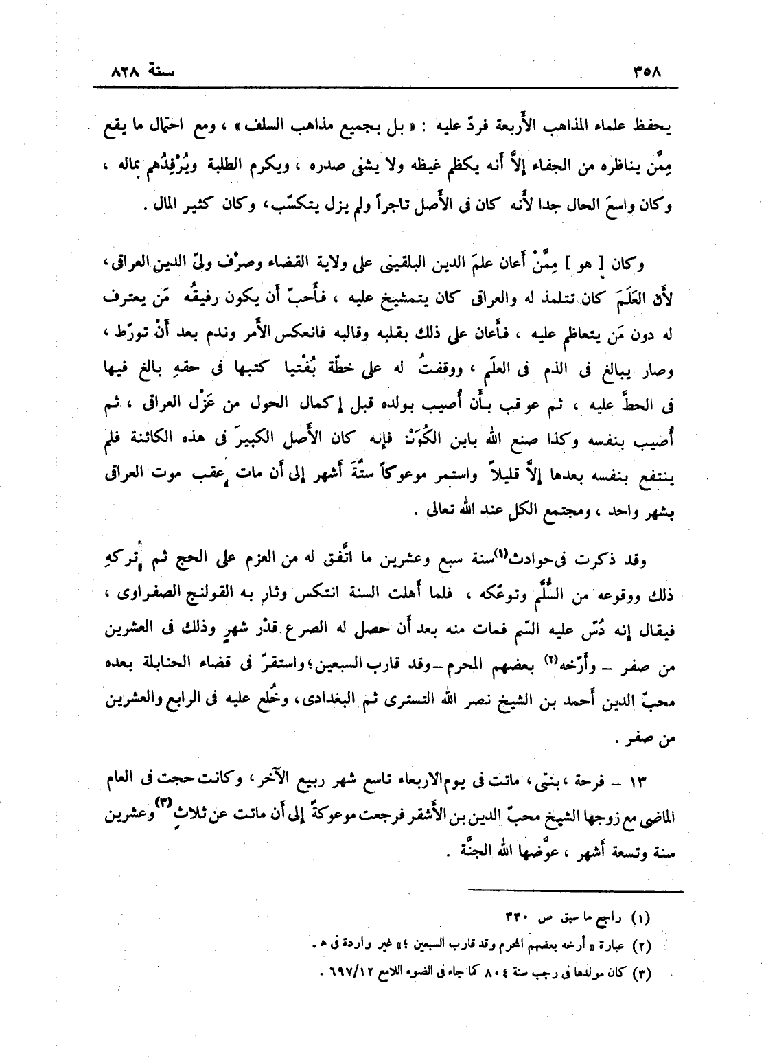 يحيط علماً بالمذاهب الأربعة - مع احتمال ما يقع ممن يناظره من الجفاء، ويكظم غيظه ولا يشفي صدره، ويكرم الطلبة ويرفدهم بماله وكان واسع الحال جداً، لأنه كان في الأصل تاجراً لم يزل يتكسب، وكان كثير ... وكان ممن أعان علم الدين صالح البلقيني على ولاية القضاء وصرف ولي الدين العراقي. لأن العلم كان يتلمذ له والعراقي كان يتمشيخ عليه فأحب أن يكون رفيقه من يعترف له دون من يتعاظم عليه فأعان على ذلك بقلبه وقالبه فانعكس الأمر، وندم بعد أن تورط وصار يبالغ في الذم من العلم، ووقفت على خطه نفساً كتبها في حقه بالغ فيها في الحط عليه، ثم عوقب بأن أصيب بولده قبل إكمال الحول من عزل العراقي ثم أصيب بنفسه، وكذا صنع الله بأن الكويز فإنه كان الأصل الكبير في هذه الكائنة فلم ينتفع بنفسه بعدها إلا قليلاً واستمر موعوكاً ستة أشهر إلى أن مات عقب موت العراقي بشهر واحد ويجتمع الكل عند الله تعالى؟ وقد ذكرت في حوادث سنة سبع وعشرين ما اتفق له من العزم على الحج ثم تركه ذلك ووقوعه من السلم وتوعكه، فلما أهلت السنة انتكس وثار به القولنج الصفراوي فيقال إنه دس عليه السم فمات منه بعد أن حصل له الصرع قدر شهر، وذلك يوم الخميس في العشرين من صفره، واستقر في قضاء الحنابلة بعده محب الدين أحمد بن الشيخ نصر الله التستري ثم البغدادي، وخلع عليه في الرابع والعشرين من صفر.