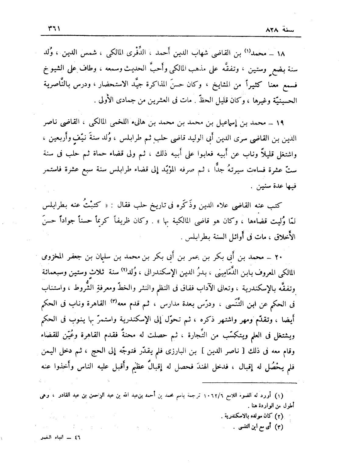 محمد بن أبي بكر بن عمر، المخزومي المالكي المعروف بابن الدماميني بدر الدين الإسكندراني، ولد سنة ثلاث وستين وسبعمائة، وتفقه بالإسكندرية وتعاني الآداب ففاق في النظم والنثر والخط ومعرفة الشروط. واستنابه ابن التنسي في الحكم ودرس بعدة مدارس، ثم قدم معه القاهرة وناب في الحكم أيضاً وتقدم ومهر واشتهر ذكره، ثم تحول إلى الإسكندرية واستمر بها ينوب في الحكم ويشغل في العلم ويتكسب من التجارة، ثم حصلت له محنة فقدم القاهرة وعين للقضاء، وقام معه في ذلك ابن البارزي فلم يقدر فتوجه إلى الحج ثم دخل اليمن فلم يحصل له إقبال، فدخل الهند فحصل له إقبال كبير وأقبلوا عليه وأخذوا عنه