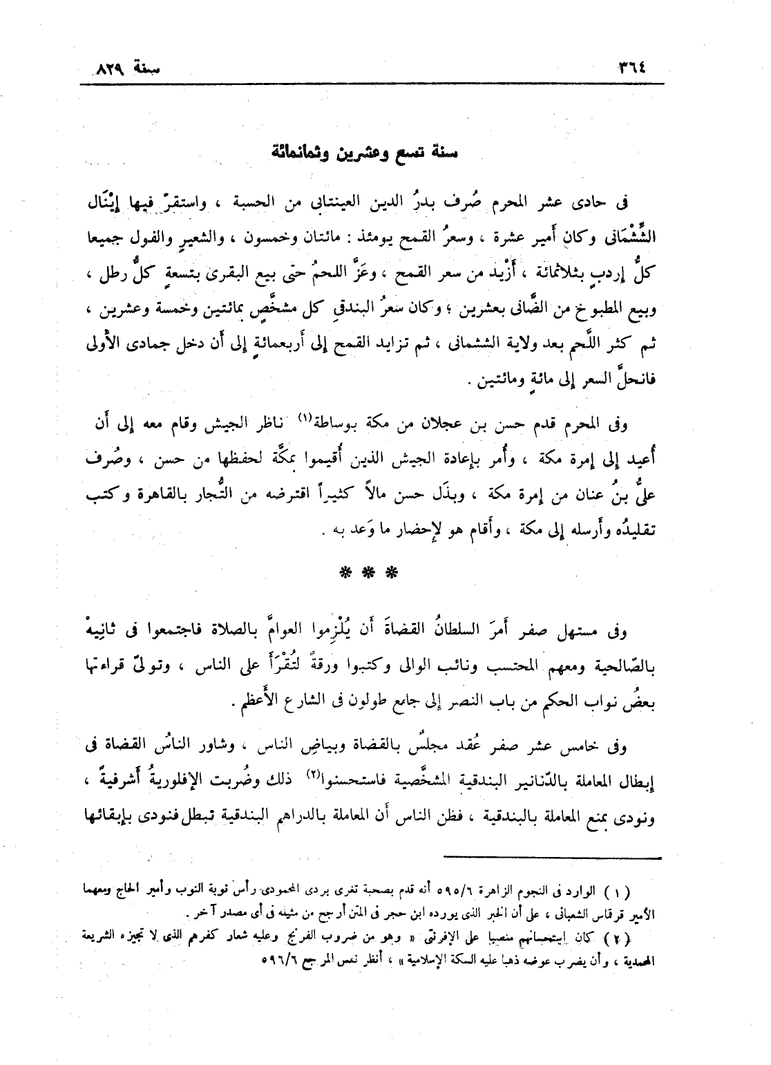 في حادي عشر المحرم صرف بدر الدين العينتابي من الحسبة واستقر فيها اينال الششماني وكان أمير عشرة، وسعر القمح يومئذ مائتان وخمسون، والشعير والفول جميعاً كل إردب بثلاثمائة أزيد من سعر القمح، وعز اللحم حتى بيع البقرى بتسعة كل رطل، وبيع المطبوخ من الضأنى بعشرين، وكان سعر الذهب البندقي كل مشخص بمائتين وخمس وعشرين، ثم كثر اللحم بعد ولاية الششماني، ثم تزايد القمح إلى أربعمائة إلى أن دخل جمادى الأولى فانحل السعر إلى ثلاثمائة ومائتين في ...