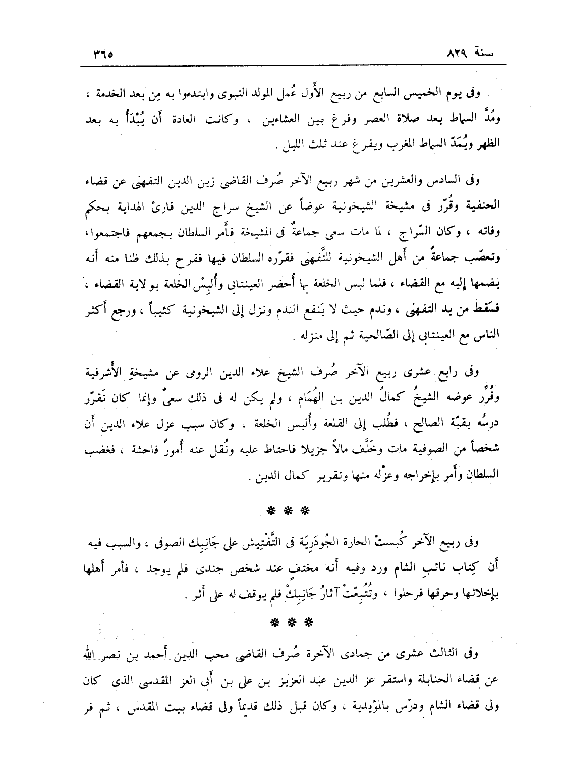 وفي الثالث عشر من جمادى الآخرة صرف القاضي محب الدين أحمد بن نصر الله عن قضاء الحنابلة، واستقر عز الدين عبد العزيز ابن علي بن أبي العز المقدسي الذي كان ولي قضاء الشام ودرس بالمؤيدية، وكان قبل ذلك قديماً ولي قضاء بيت المقدس، ثم فر