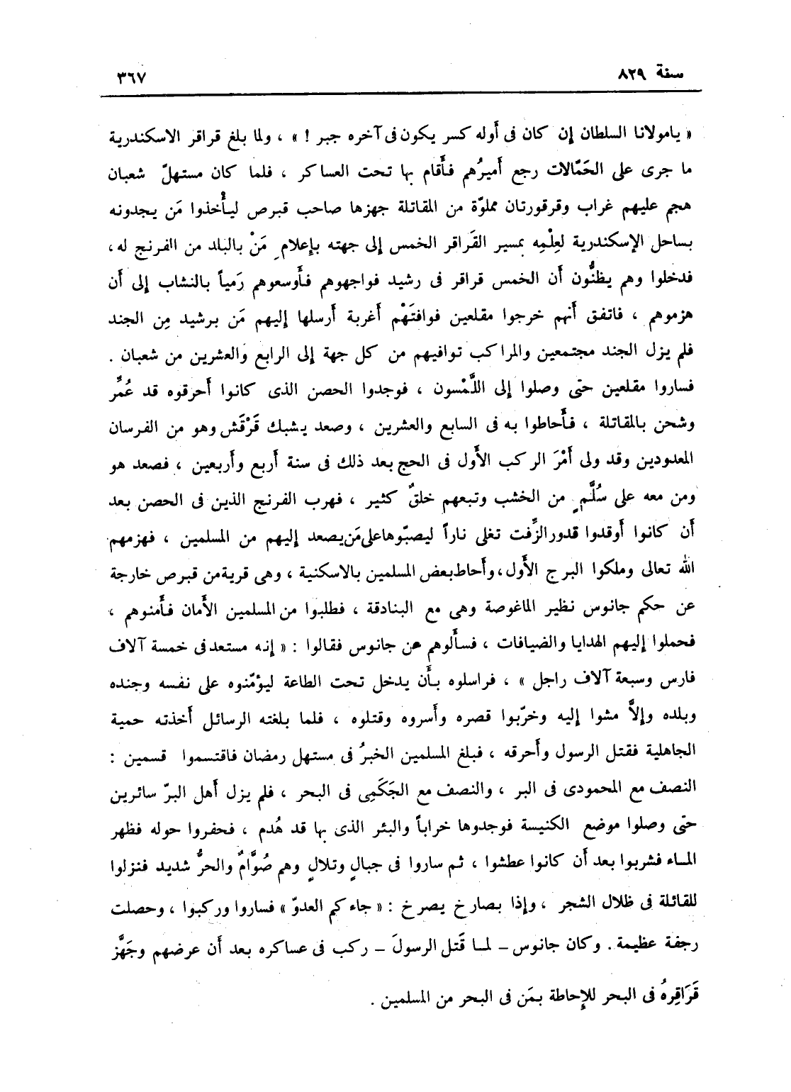 يا مولانا السلطان! إن من كان أوله كسر يكون في آخره جبر؛ ولما بلغ قراقر الإسكندرية ما جرى على الحمالات رجع أميرهم فأقام بعا تحت العساكر، فلما كان مستهل شعبان هجم عليهم غراب وقرقوران مملوءة من المقاتلة جهزهم صاحب قبرس ليأخذوا من يجدونه بساحل الإسكندرية لعلمه بمسير القراقز الخمس إلى جهته بإعلام من بالبلد من الفرنج له، فدخلوا وهم يظنون أن الخمس قراقب في رشيد، فواجهوهم فأرشقوهم رمياً بالنشاب إلى أن هزموهم فاتفق أنهم خرجوا مقلعين فوافتهم أغربة أرسلها إليهم من برشيد من الجند، فلم يزل الجند مجتمعين والمراكب توافيهم من كل جهة إلى الرابع والعشرين من شعبان، فساروا مقلعين حتى وصلوا إلى اللمسون فوجدوا الحصن الذي كانوا أحرقوه قد عمر وشحن بالمقاتلة فأحاطوا به في السابع والعشرين، وصعد يشبك قرقش وهو من الفرسان المعدودين وقد ولي إمرة الموكب الأول في الحج بعد ذلك في سنة 44، فصعد هو ومن معه على سلم من خشب وتبعهم خلق كثير، فهرب الفرنج الذين في الحصن بعد أن كانوا أوقدوا قدور الزفت تغلي ناراً ليصبوها على من يصعد إليهم من المسلمين، فهزمهم الله تعالى وملكوا البرج الأول؛ وأحاط بعض المسلمين بالأسكتية وهي قرية من قبرس خارجة عن حكم جابوش نظير الماغوصة وهي مع البنادقه، فطلبوا من المسلين الأمان فأمنوهم، فحملوا إليهم الهدايا والضيافات، فسألوهم عن جابوش فقالوا إنه مستعد في خمسة آلاف فارس وسبعة آلاف راجل، فراسلوه بأن يدخل تحت الطاعة ليؤمنوه على نفسه وجنده وبلده وإلا مشوا عليه وخربوا قصره وأسروه وقتلوه، فلما بلغته الرسالة أخذته حمية الجاهلية فقتل الرسول وأحرقه، فبلغ المسلمين الخبر في مستهل رمضان فانقسموا قسمين النصف مع المحمودي في البر والنصف مع الجكمي في البحر، فلم يزل أهل البر سائرين حتى وصلوا موضع الكنيسة فوجدوها خراباً والبئر الذي بها قد هدم، فحفروا حوله فظهر الماء فشربوا بعد أن كانوا عطشوا. ثم ساروا في جبال وتلال وهم صوام والحر شديد فنزلوا للقائلة في ظلال الشجر وإذا بصارخ صرخ: جاءكم العدو! فثاروا وركبوا وحصلت رجفة عظيمة، وكان جابوش لما قتل الرسول ركب في عساكره بعد عرضهم، وجهز قراقرة في البحر للإحاطة بمن في البحر من المسلمين،